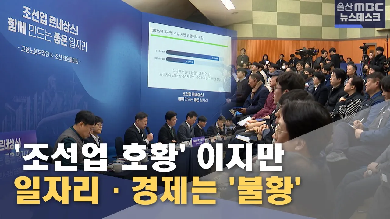 주요뉴스 '조선업 호황' 체감은 '극과 극'‥ 해법은? [앵커]조선업이 다시 호황 국면에 들어섰지만, 정작 지역에서는 경기 회복을 체감하기 어렵다는 목소리가 이어지고 있습니다.최근 울산을 찾은 이재명 대통령도 조선업의 외국인 노동력 의존에 따른 지역 경제 침체 문제를 지적했는데요.고용노동부 장관이 울산을 찾아 노사와 지역사회가 함께 해법을 논의했습니다.이다은 ... 중학교 배정 "근거리 도입"‥ 비율 두고 이견 MBC뉴스데스크 52 검은 흙으로 뒤덮인 논‥ 구청은 '뒷짐' MBC뉴스데스크 62 선관위, '허위 딥페이크 영상' 선거운동 첫 고발 MBC뉴스데스크 44 식당 화재 산불로 번져‥ "화목보일러 추정" MBC뉴스데스크 54 '저장 강박 위기가구' 지원 사업 강화 낮부터 추위 풀려‥ 내일 눈 또는 비 울산시-지역 기업, 전통시장 장보기 행사 6.3 지방선거 예비후보 등록 본격 시작 민주당 울산시당 지방선거 '공관위' 구성 완료 김동칠 시의원, 남구청장 선거 도전 설 연휴 기간 불법 현수막 일제 정비 진보당 "북울산역 연계교통·편의시설 확충" 산업수도 상징 공업탑 이전‥ 디자인 공모 기획·연속 보도 [연속기획③] '대세론' 속 '신중론'‥ 행정통합 해법은? MBC뉴스데스크 144 [연속기획 ②] 대한민국 경제 심장 울산‥ 시민 삶의 질은? MBC뉴스데스크 775 [연속기획①] 2%가 짊어진 무게‥ 힘차게 뛰는 산업 심장 MBC뉴스데스크 119 [되돌아본 뉴스] '전형적'에서 '극과 극' 달라지는 겨울 MBC뉴스데스크 152 [결산2025] 키워드로 돌아본 '2025 울산 스포츠' MBC뉴스데스크 206 [결산 2025] 끝나지 않은 '내란세력 청산'‥ 지방선거 화두로 MBC뉴스데스크 154 [결산 2025] 끊이지 않는 산재 참사‥ 대형 산불에 폭우까지 MBC뉴스데스크 239 [결산 2025] 기대 모은 '공룡 조선소'‥ 남은 과제는? MBC뉴스데스크 533 [2025결산] 울산 경제, 미·중 여파에 희비 교차 MBC뉴스데스크 375 [연말결산] AI가 예측한 미래도시 울산은? MBC뉴스데스크 263 영상스케치 연분홍 연꽃, 사진에 담다 [영상스케치] 118 울산 겹벚꽃 명소 [영상스케치] 89 04.16 기억과 추모 [영상스케치] 87 울산에 또 무슈샤가 [영상스케치] 88 TV 프로그램 prev next 서머페스티벌 JUMP 울산 금 17시 55분 새롭게 바뀐 2025 JUMP 울산!!매주 금요일 17:55 ~ 18:05에 만날 수 있습니다.YOUTUBE '울산MBC' 채널에서도 만날 수 있습니다!! 울트라 월 화 수 18시 05분 6시 내고향 울산의 생생한 정보는 울트라가 전한다고 전해라~ 내가 사는 동네에서 벌어지는 별나고 재미난 이야기 아낌 없이 대방출! 심심하고 삼삼한 울산의 저녁을 웃음과 감동으로 채워드립니다. 체인지 UP 목 21시 00분 울산의 변화와 발전을 위해 우리가 나아가야 할 방향은? 바뀌고(change), 발전될(up) 울산을 꿈꾸며 [체인지UP]이 함께 합니다. 더보기 Radio 프로그램 prev next 더보기 뉴미디어 문화행사 prev next 더보기 공지사항 2026년도 울산MBC 시청자위원 공개모집[마감] 2025-12-08 10:23 2026년 사원 공개채용 공고 2025-11-17 11:06 울산MBC 2025 뉴스디렉터 최종합격자 공고 2025-03-31 11:34 울산MBC 2025 뉴스디렉터 공채 2차 역량평가 합격자 공고 2025-03-25 09:55 울산MBC 2025 뉴스디렉터 채용 1차 서류전형 합격자 공고 2025-03-14 14:20 더보기