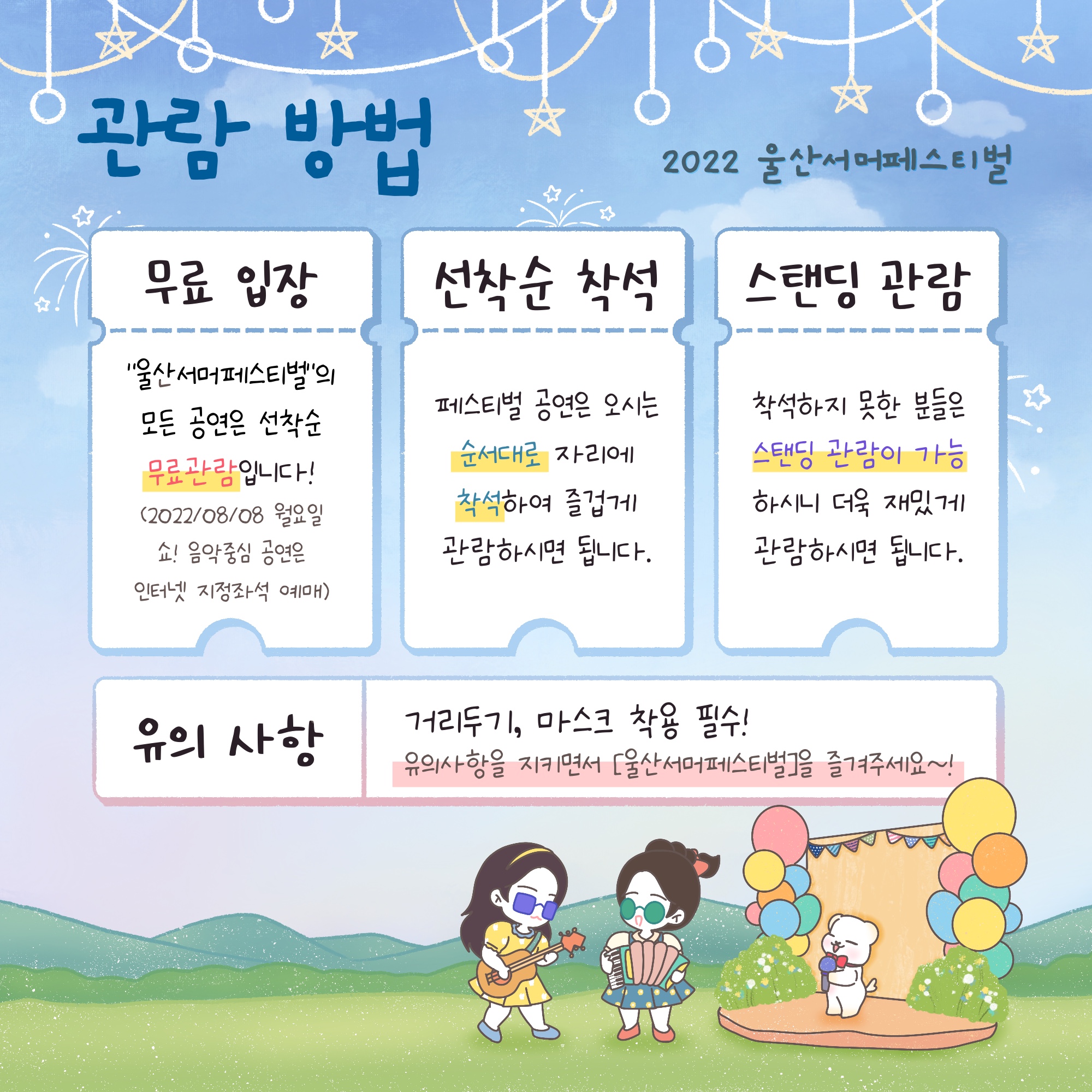 - "울산 서머페스티벌"의 모든 공연은 선착순 무료관람입니다. (단, 8월 8일 쇼!음악중심 공연은 인터넷 지정좌석 예매)