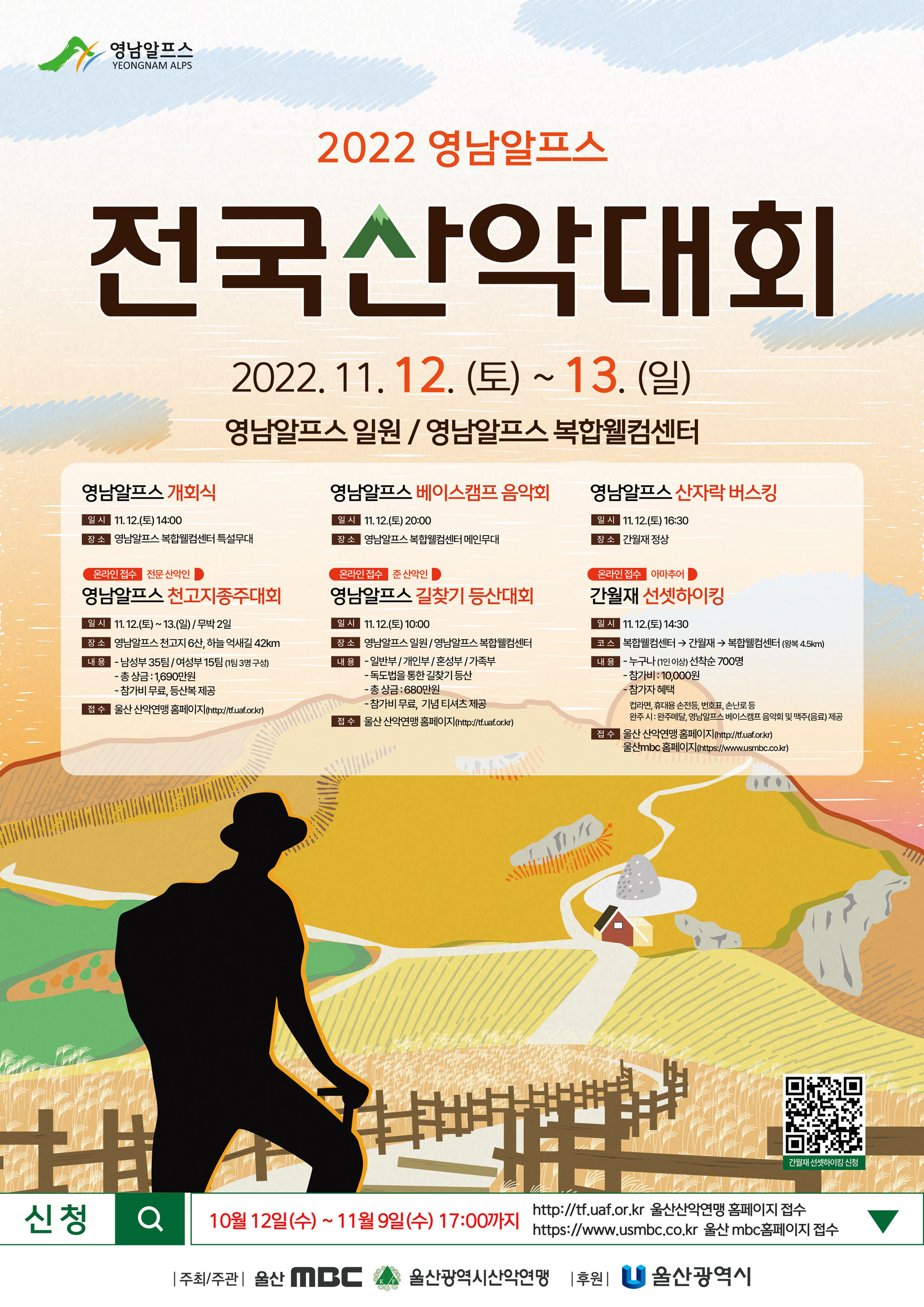 <2022 영남알프스 전국산악대회> 행사기간 내 우천예보 등 기상악화로(11/10 16:00 현재), 참가자들의 안전을 위해 "개회식"은 11월 12일(토) 09:30으로 변경, "간월재 선셋하이킹", "베이스캠프 음악회" 및 행사기간 셔틀버스 운행은 취소되었음을 알려드립니다.