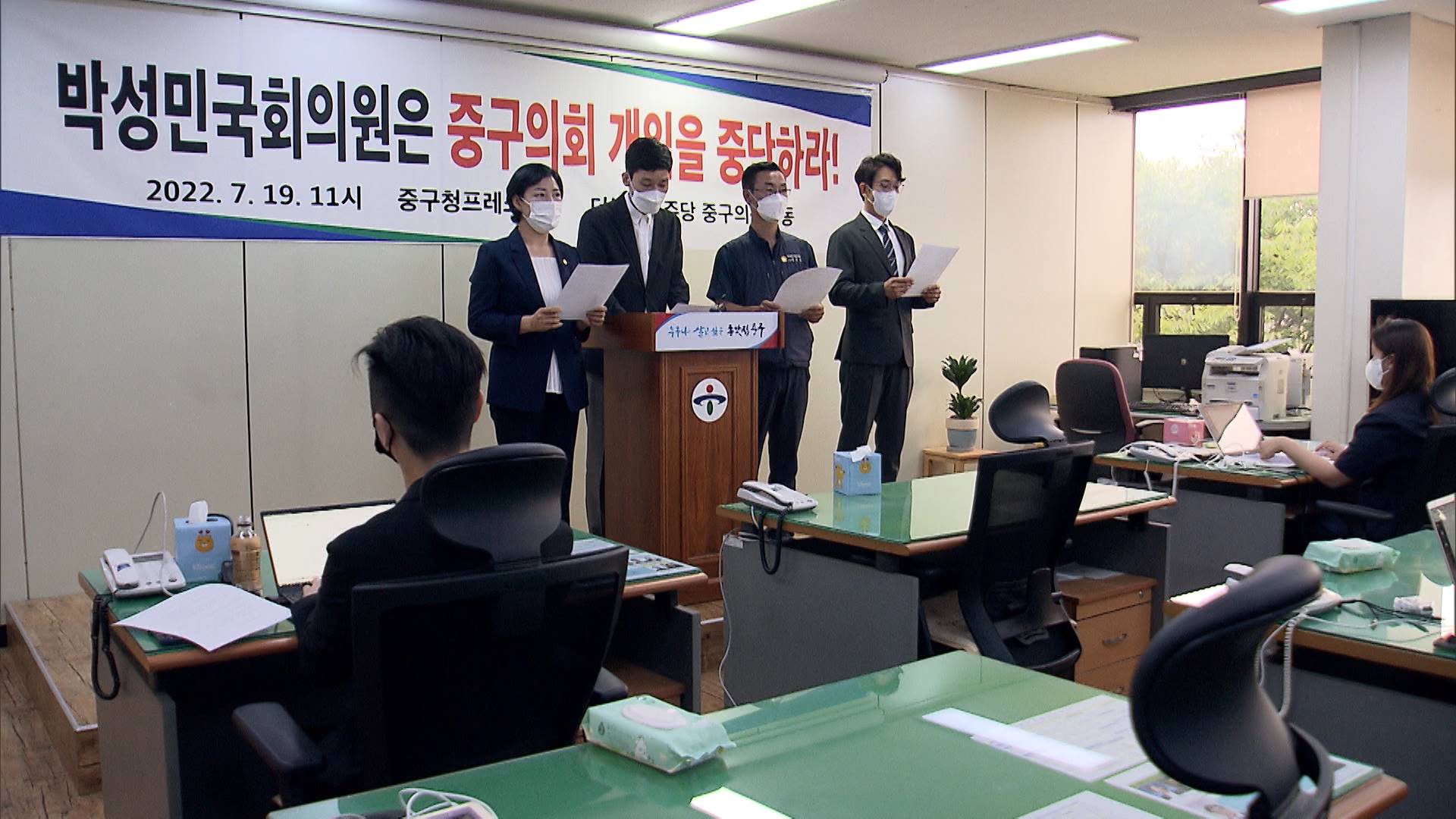 민주당 소속 중구의회 의원 4명이 오늘(7/19) 중구청 프레스센터에서 기자회견을 열고 박성민 국회의원과 중구당협의 개입으로 원구성이 파행으로 치닫고 있다고 주장했습니다. 이들은 의회 부의장 자리를 양보하고 여당에서 제안한 의회운영위원장과 복지건설위원장을 받아들이기로 했는데 국민의힘 의원들이 이 약속을 파...