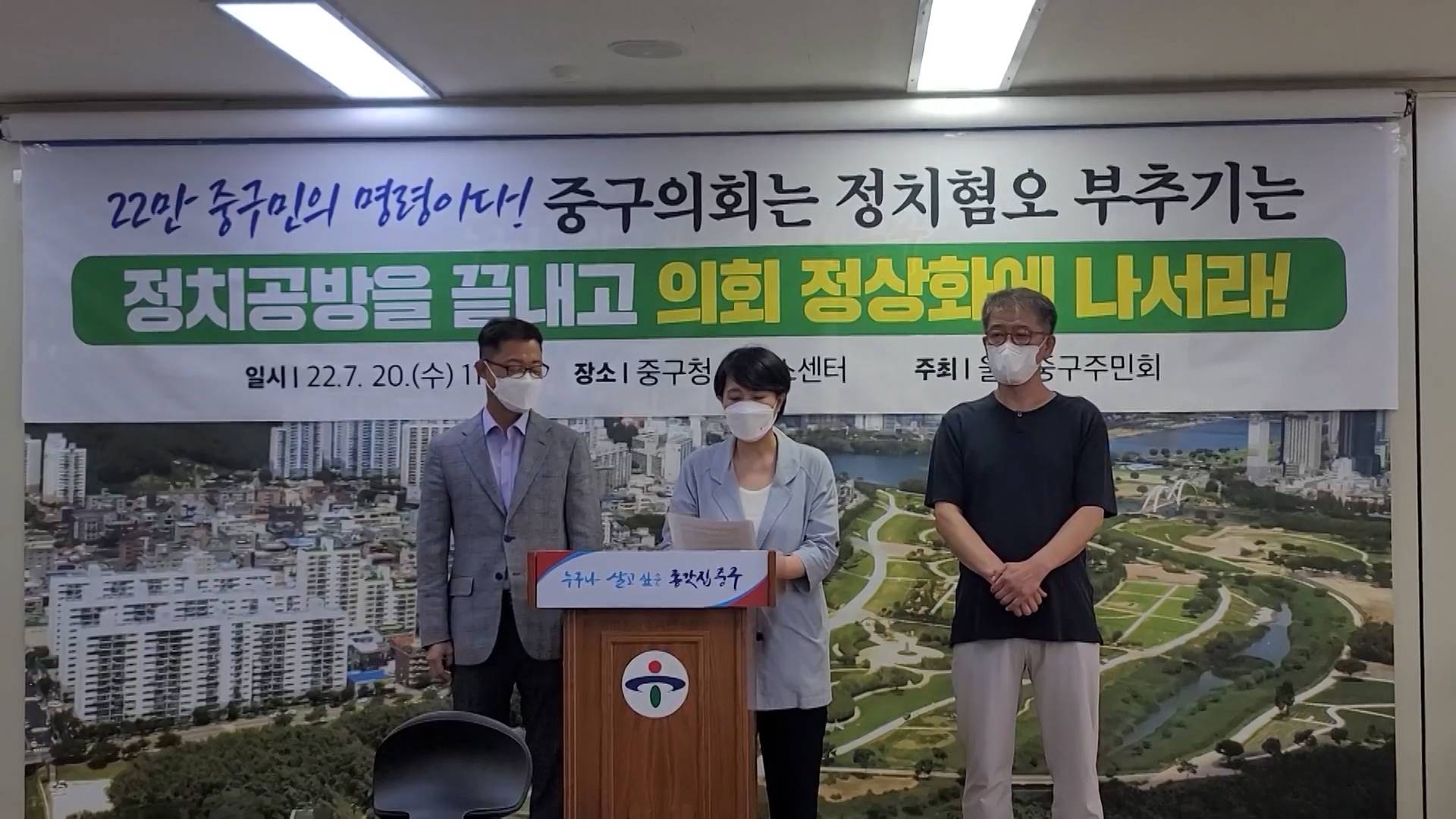 울산 중구 주민회가 오늘(7/20) 중구청 프레스센터에서 기자회견을 열고 중구의회 국민의힘과 민주당 양당 의원들의 정치 공방을 비판했습니다. 이들은 8대 의회는 원구성조차 마무리하지 못하며 협치의 모습을 보이지 못하고 있다며 주민들의 비판을 면하기 어려울 거라고 주장했습니다. 또 강혜순 중구의회 의장에게 원구...
