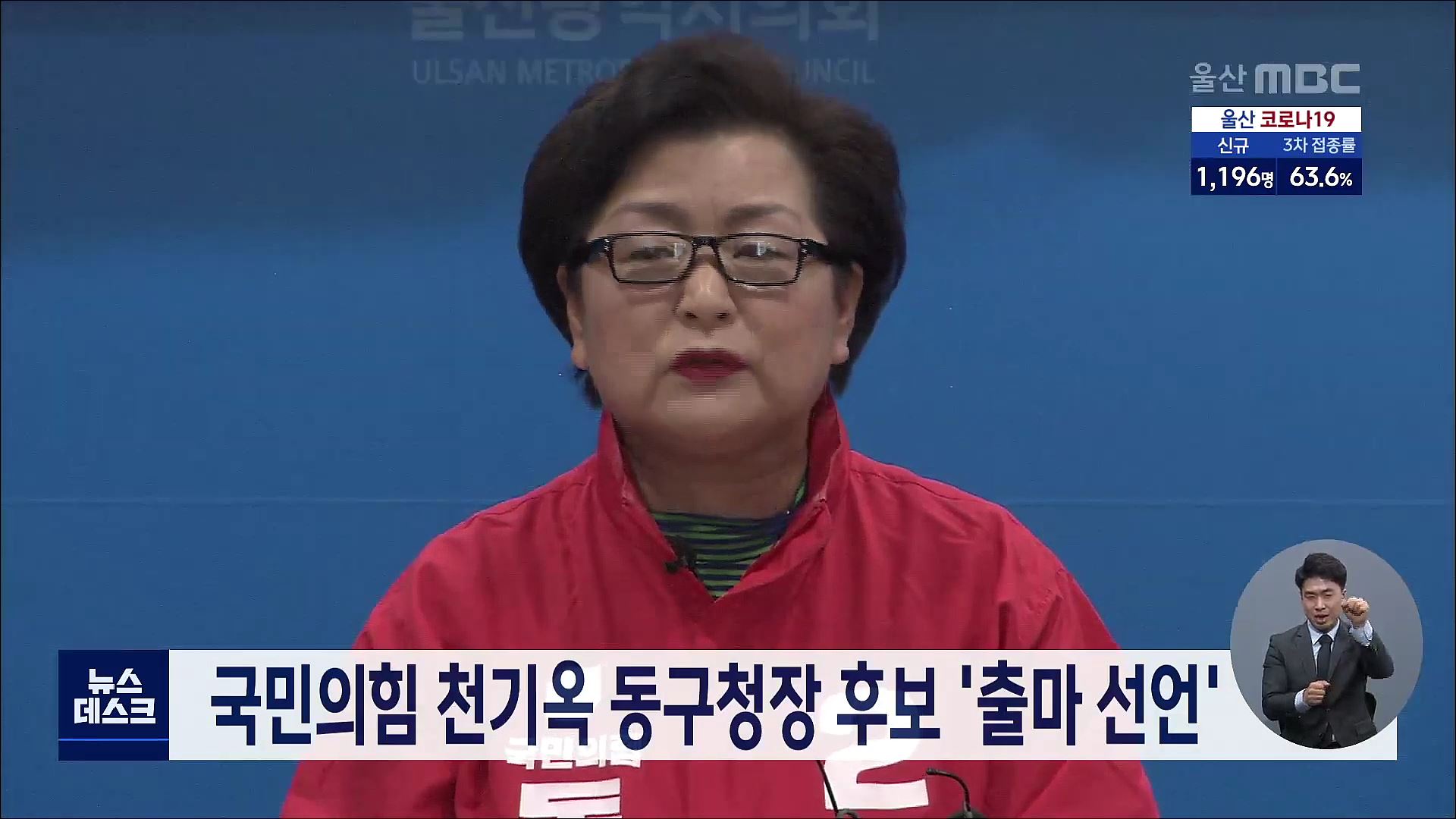 천기옥 전 시의원이 오늘(5/2) 동구청장 출마를 선언하고 동구의 정주여건을 획기적으로 개선하겠다고 약속했습니다. 국민의힘 동구청장 공천장을 받은 천 전 시의원은 아이 키우기 좋은 도시, 청장년층, 노년층이 함께 어우러지는 삶의 질이 높은 동구를 만들겠다고 공약했습니다.