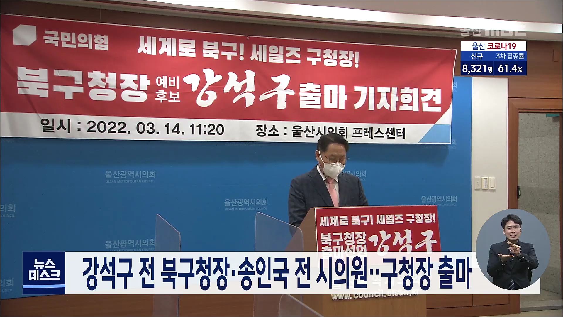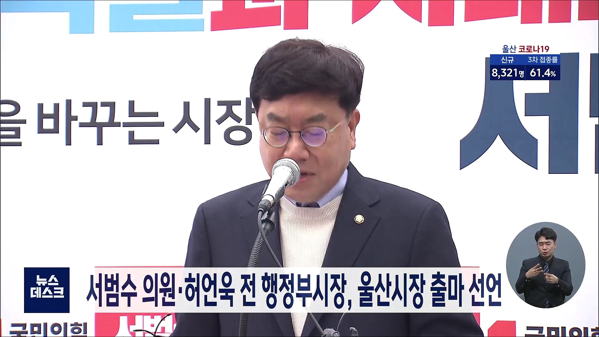 서범수 국회의원이 오늘(3/14) 남구 공업탑에서 시장 출마를 선언했습니다. 서 의원은 윤석열 대통령 당선인과 시대교체를 통해 내 삶은 바꾸는 젊은 도시, 스마트 울산을 만들겠다고 약속했습니다. 허언욱 울산시 전 행정부시장도 울산시장 출마를 선언했습니다. 허 전 부시장은 충분한 공직 경험을 살려 글로벌 혁신마인...