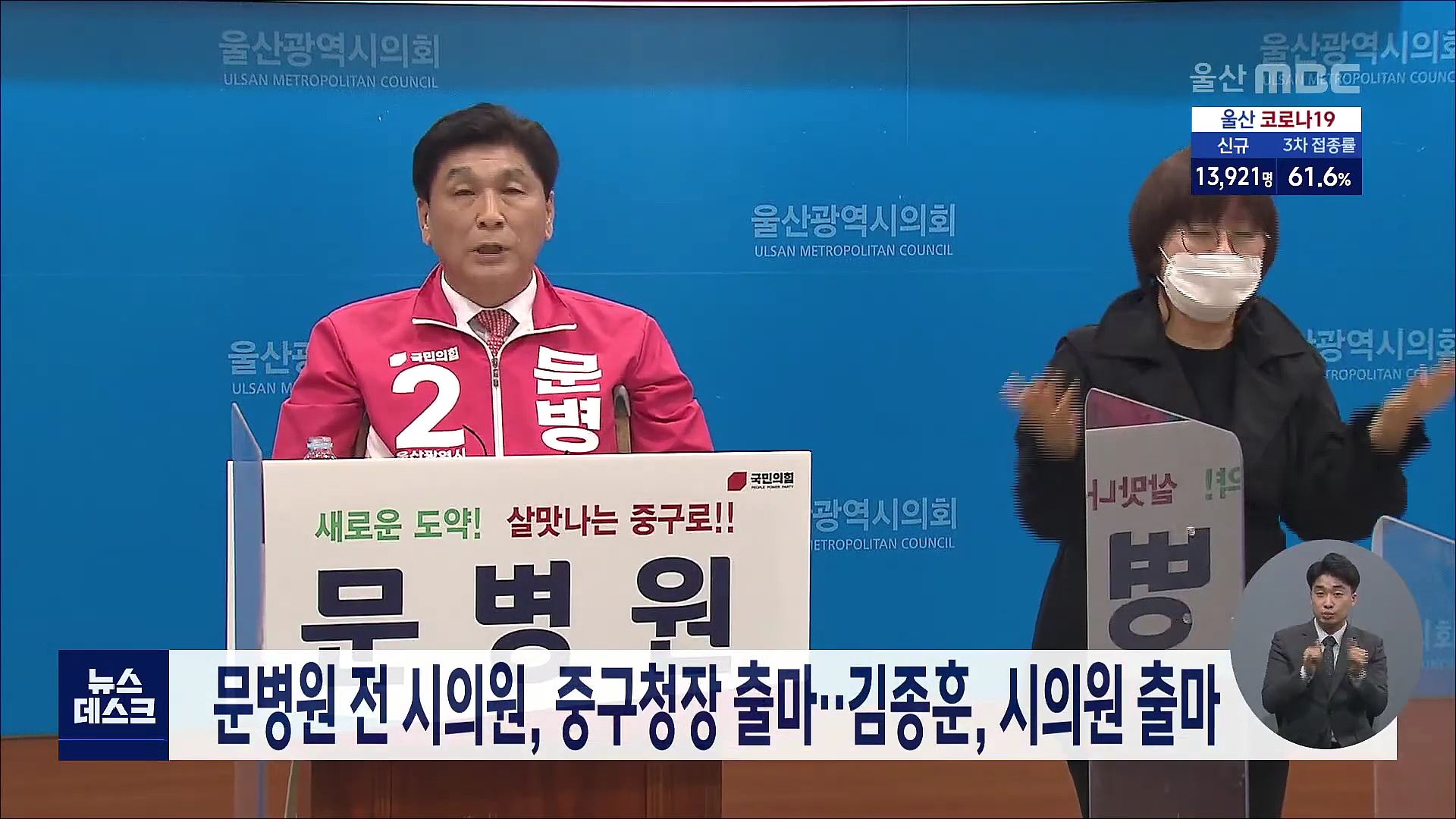 문병원 전 시의원은 오늘(3/15) 국민의힘 소속으로 중구청장에 도전한다고 밝혔습니다. 문 전 시의원은 울산에서 가장 살고 싶은 도시, 중구의 명성을 다시 되찾아오겠다며 주민이 원하는 행정을 펼치겠다고 약속했습니다. 김종훈 범서읍 바르게살기운동 부회장도 기자회견을 열고, 국민의힘 소속으로 울주군 범서˙청량읍 ...