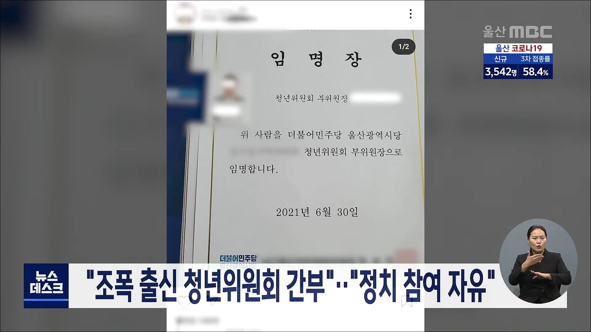 "조폭 출신 청년위원회 간부".."정치 참여 자유"