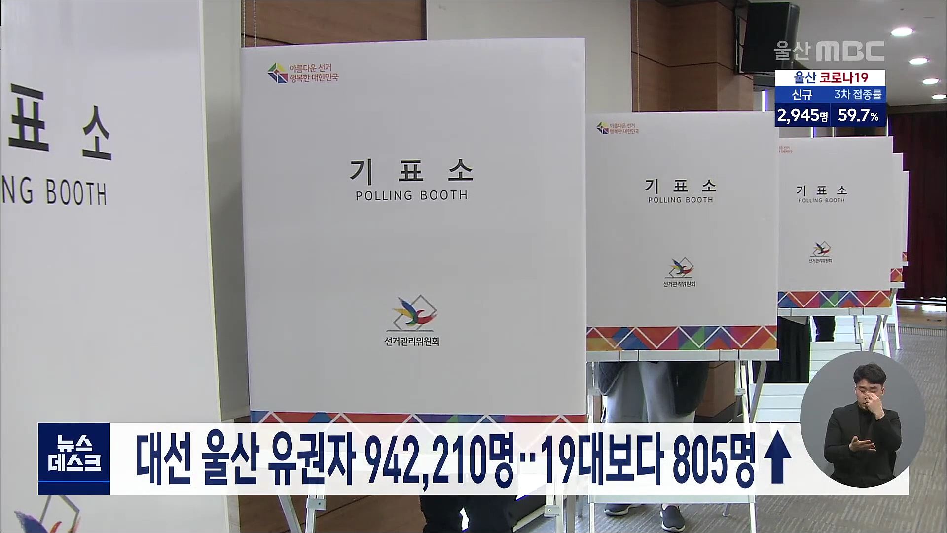 3월 9일 제20대 대통령 선거에 투표할 수 있는 울산지역 유권자 수는 94만2천210명으로 집계됐습니다. 울산시선관위가 선거인 명부를 확정한 결과, 울산 유권자는 지난 2017년 19대 대선보다 805명 늘어났지만, 지난 2020년 21대 총선보다 1만1천438명이 감소했습니다.