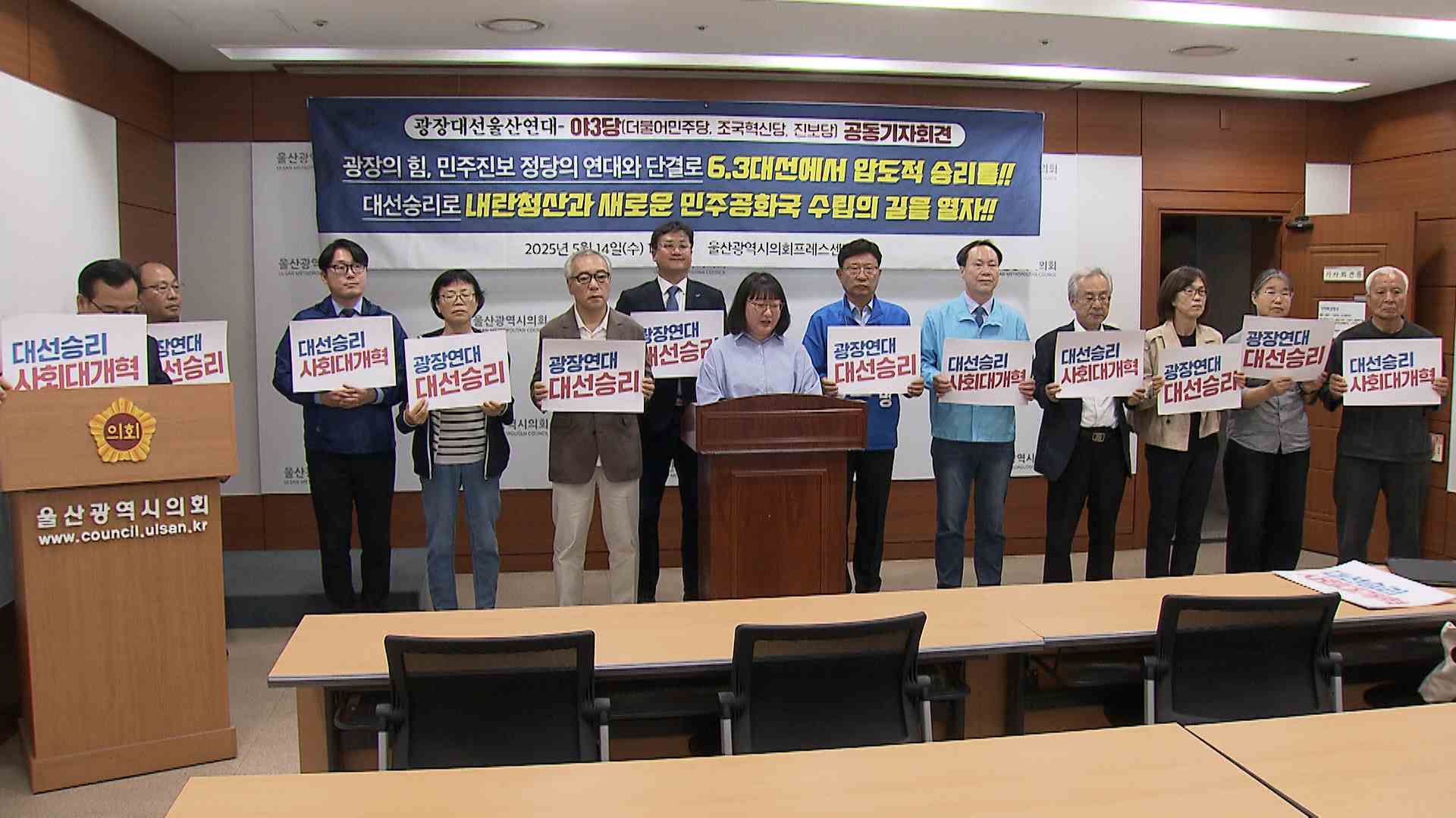 울산지역 시민단체와 노동계 등이 참여하는 광장대선울산연대와 더불어민주당, 조국혁신당, 진보당이 오늘(5/14) 공동 기자회견을 열고 이재명 후보 당선에 힘을 모으기로 했다고 밝혔습니다. 이들은 내란 세력의 완전 종식과 함께 기득권 세력을 뿌리 뽑고 새로운 민주공화국 건설을 위해서는 민주당 이재명 후보가 압도적...