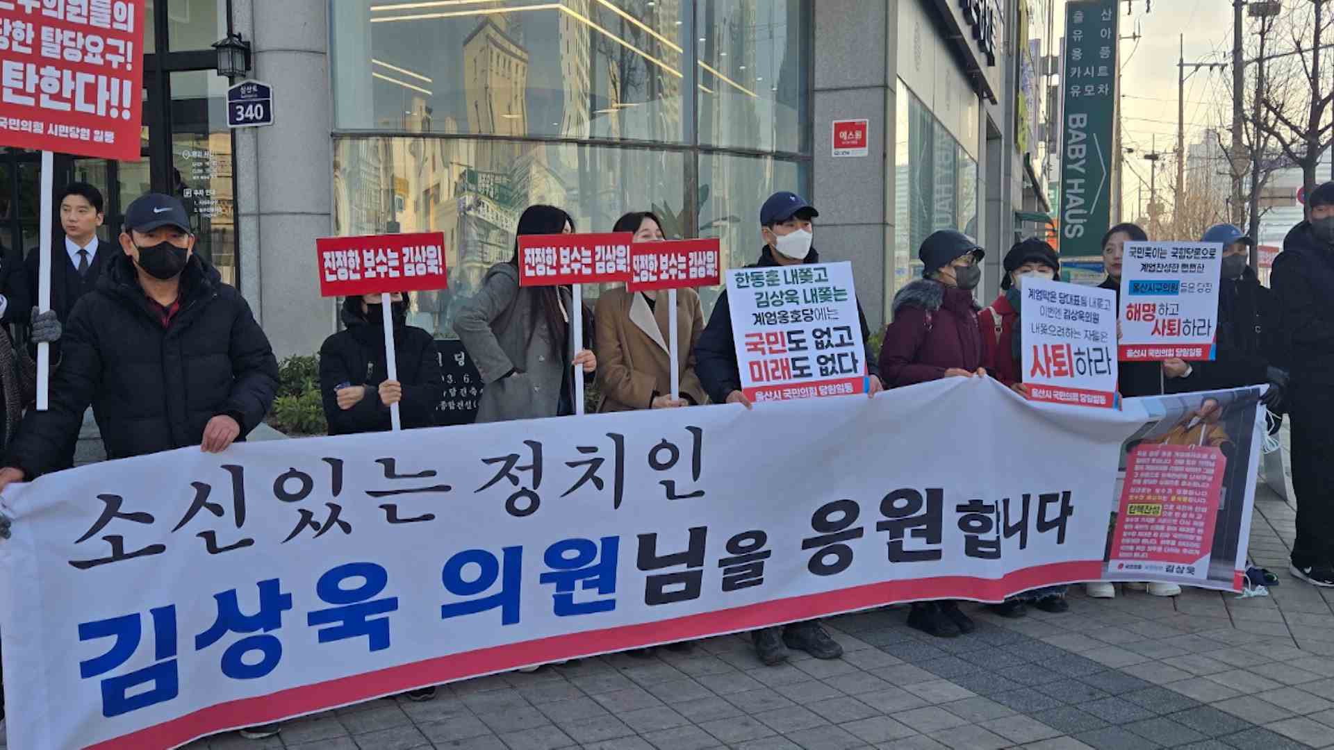 국민의힘 한동훈 전 대표를 지지하는 모임 회원 30여 명은 오늘(1/24) 국민의힘 울산시당 앞에서 김상욱 의원 지지 집회를 가졌습니다. 전국에서 모인 이들은 김상욱 의원의 탈당을 촉구하는 울산지역 친윤 국회의원과 지방의원들이 내란 수괴인 윤석열 대통령을 옹호하고 있다며 이들의 사퇴를 요구했습니다.