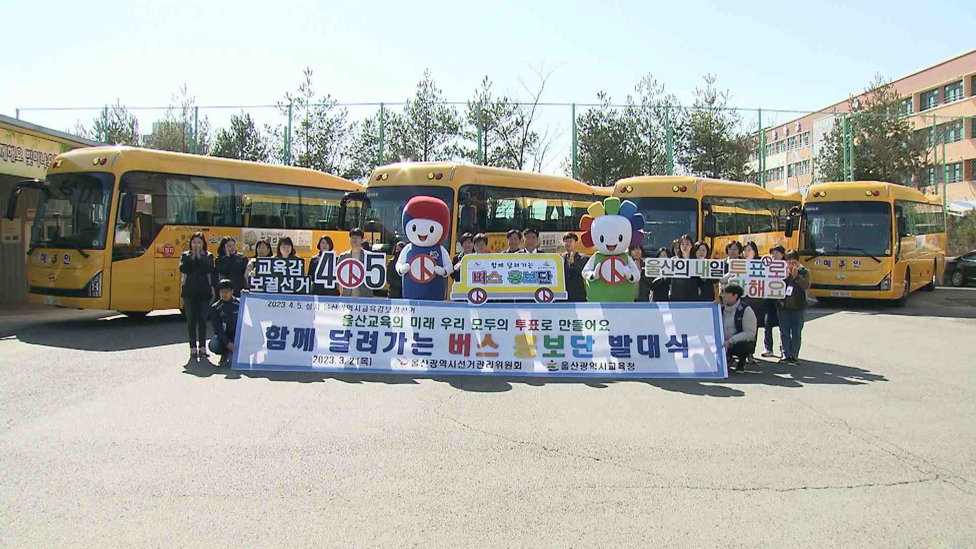 다음 달 5일 치러지는 울산시교육감 보궐선거를 앞두고 통학버스 홍보단이 구성됐습니다. 울산시교육청과 울산시선거관리위원회는 오늘(3/2) 중구 혜인학교에서 버스홍보단 발대식을 열고 울산 전 지역에 운행되는 통학버스를 이동식 캠페인 수단으로 활용하기로 했습니다. 교육청이 소유한 통학버스 28대가 우선 투입되며 ...