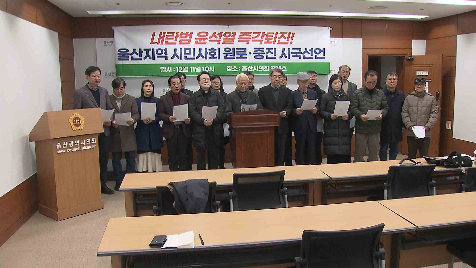 울산지역 시민사회 원로·중진들은 오늘(12/11) 기자회견을 열고 내란에 동조한 국민의힘은 정권 연장 계획을 즉각 중단하라고 주장했습니다. 임상호 울산진보연대 상임대표와 성인수 울산대 명예교수, 송철호 전 울산시장 등 100여 명은 연대 서명을 통해 반민주적 비상계엄을 선포한 윤석열 대통령과 공범들을 구속해야 한...