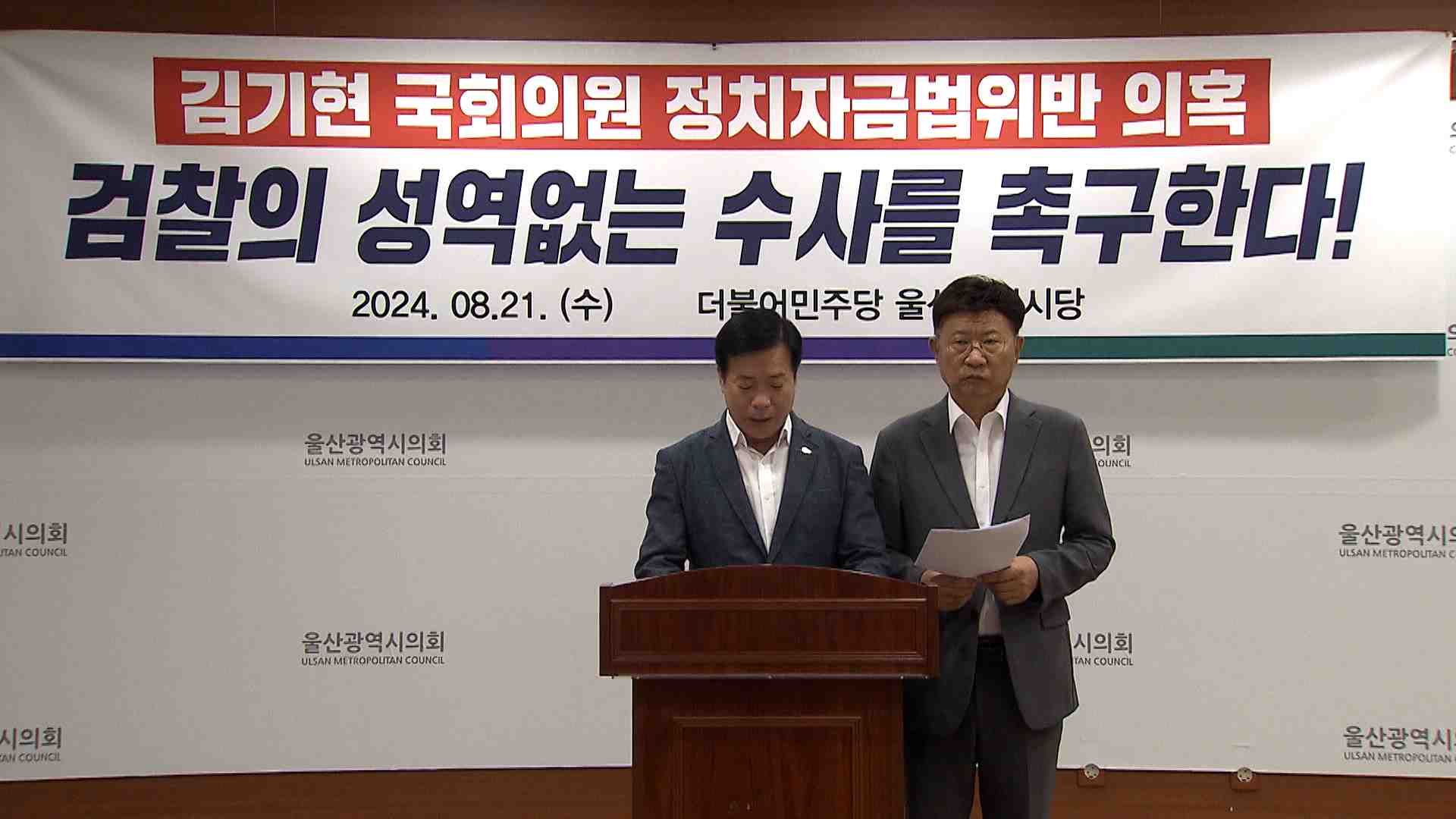 더불어민주당 울산시당은 오늘(8/21) 기자회견을 열고 김기현 의원의 야유회 행사 비용 대납 의혹에 대한 엄정한 수사를 촉구했습니다. 민주당은 지난 16일 울산mbc 보도에서 보듯 이번 사건은 고발인과 피고발인이 명백한 정치자금법 위반 사건이라고 주장했습니다. 또 당원이 국회의원을 고발한 점으로 미뤄 심각한 내부 ...