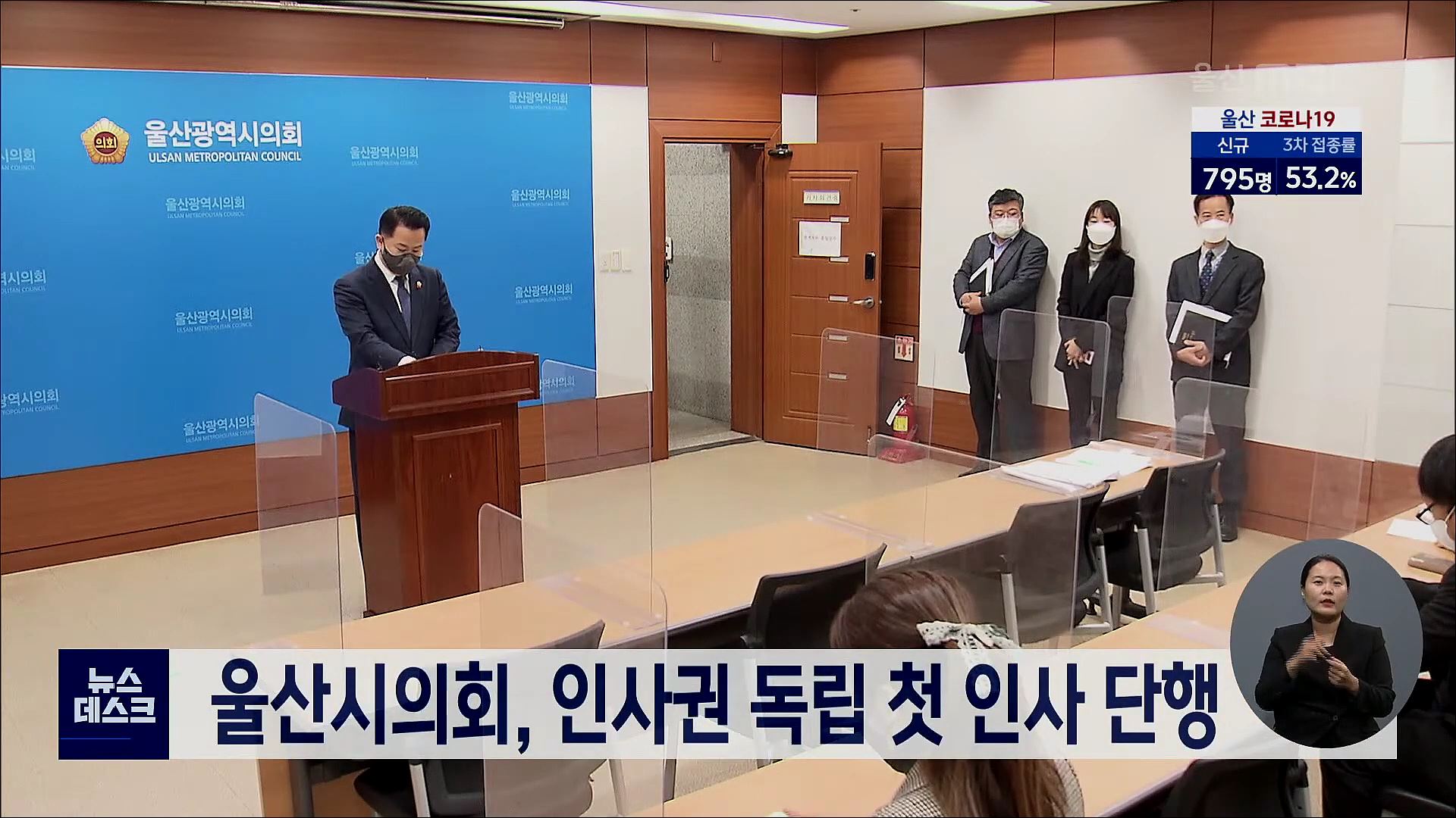 울산시의회는 오늘(2/10) 지방의회 인사권 독립에 따른 첫번째 인사를 단행했습니다. 박병석 울산시의회 의장은 울산은 타 시도와 달리 3급이던 의회사무처장 직급을 2급으로 상향하는 승진 인사를 이번에 단행했다고 의미를 부여했습니다.