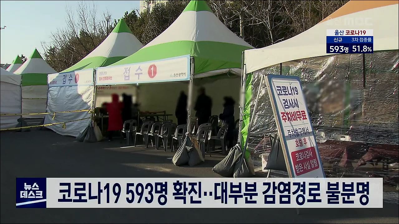 오늘(2/6) 울산에서는 코로나19 신규 확진자가 593명 발생했습니다. 이들 중 257명은 기존 확진자의 접촉자이고 나머지 335명은 감염 경로가 확인되지 않았으며 1명은 해외입국자입니다. 한편 오늘 0시 기준으로 울산에서는 인구의 51.8%가 코로나19 백신 3차 접종을 마쳤습니다.//