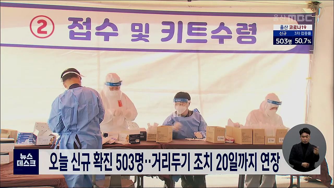 오늘(2/4) 울산에서는 코로나19 신규 확진자가 503명 발생해 일일 확진자 최다 기록을 다시 바꿨습니다. 울산시는 지역의 확산세가 심각하다며 기존의 사회적 거리두기 조치를 오는 20일까지 2주 연장하기로 했습니다. 사적 모임은 6명까지만 가능하며 식당과 유흥시설 등의 영업시간은 오후 9시로 제한됩니다.