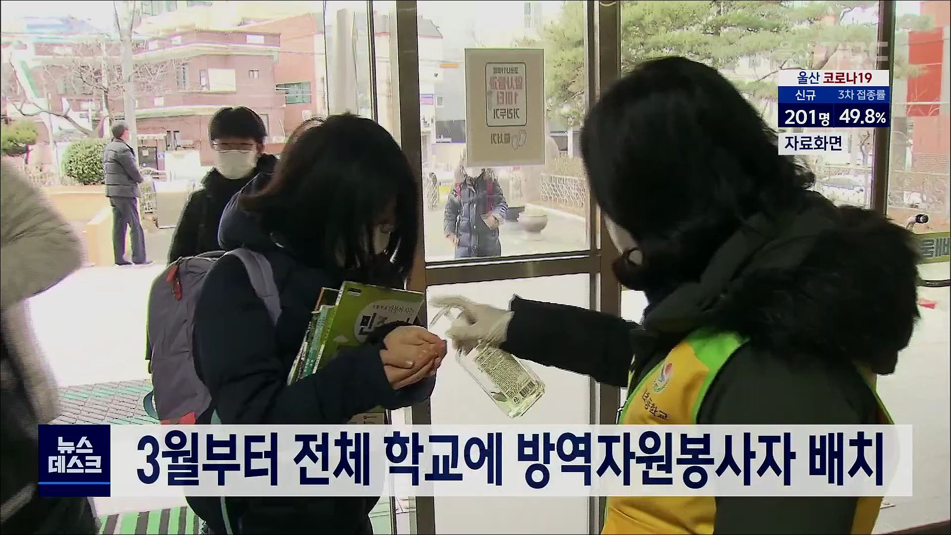 오는 3월부터 전체 유치원과 학교에 방역 자원봉사자가 배치됩니다. 울산시교육청은 자체 예산 53억8천700만 원을 확보해 학교별로 1학기 방역 자원봉사자 1천800여 명을 지원합니다. 방역자원봉사자는 발열검사와 출입자 관리 지원, 학생 이용시설 방역 지원, 교내 거리두기와 마스크 착용 지도 등 학교 방역 업무를 지원...