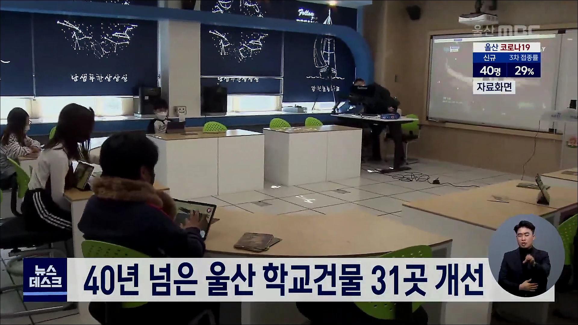 울산시교육청이 40년 이상 된 학교 건물을 개선하기 위해 내년 1월 1일 자로 그린스마트 미래학교 추진단을 신설합니다. 시교육청은 3천600억원을 들여 오는 2025년까지 초등학교 18곳과 중학교 10곳, 고등학교 2곳, 특수학교 1곳 등 31개 학교를 미래학교로 조성할 계획입니다.
