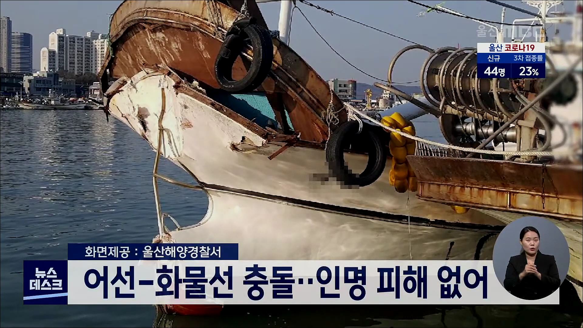 오늘(12/23) 오후 2시쯤 북구 당사항 북동쪽 7.4킬로미터 해상에서 9톤 급 어선과 1천570톤 급 화물선이 충돌했습니다. 어선에는 선원 4명이 타고 있었지만 인명 피해는 없었습니다. 울산해경은 조업을 마치고 입항하던 어선과 항해 중이던 화물선이 부딪친 경위를 조사하고 있습니다.