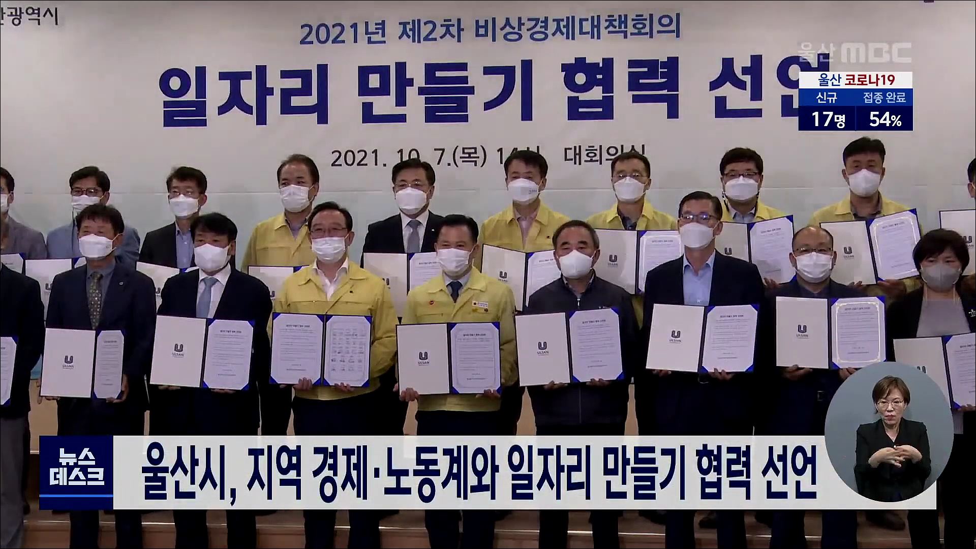 울산시는 오늘(10/7) 행정과 경제, 노동계 등과 함께 '일자리 만들기 협력 선언'을 했습니다. 이들은 청년 일자리를 확대하기 위해 청년을 채용하고 고용을 유지하는 기업에 특별장려금을 주고, 청년의 인턴 활동과 취업 준비 과정을 지원하기로 했습니다. 또 중장년층의 재취업 여건을 개선하기 위해서 은퇴 예정자에 대한...