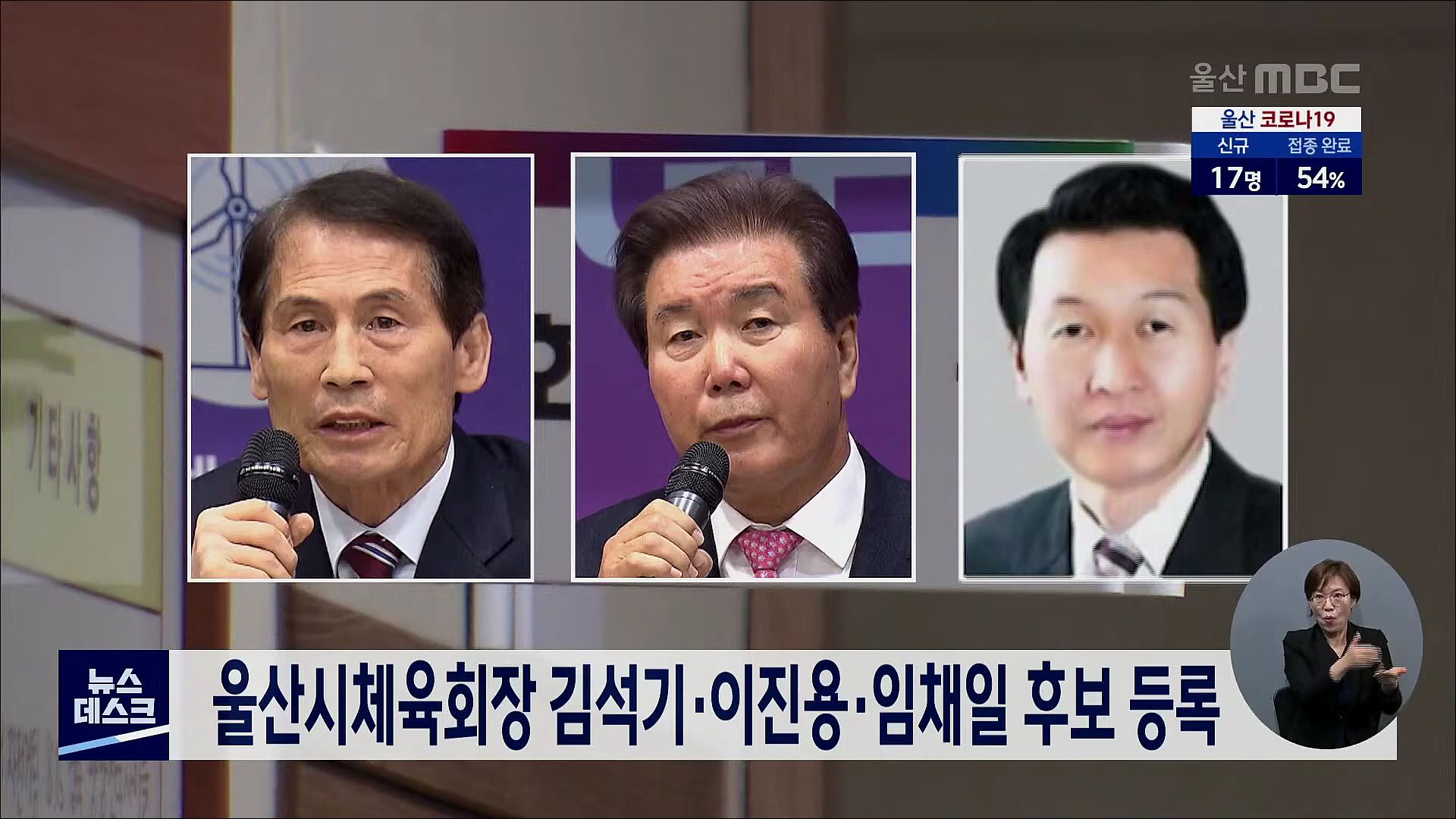 울산광역시 체육회장 재선거 후보 등록 첫날인 오늘(어제) 모두 3명의 후보가 등록했습니다. 후보는 울산시교육감을 지낸 김석기 씨와 태화관광 대표이자 직전 회장이던 이진용 씨, 울산시자전거연맹회장인 임채일 씨로, 내일(오늘) 후보등록을 마무리하고 오는 18일 선거인단 투표가 실시될 예정입니다.