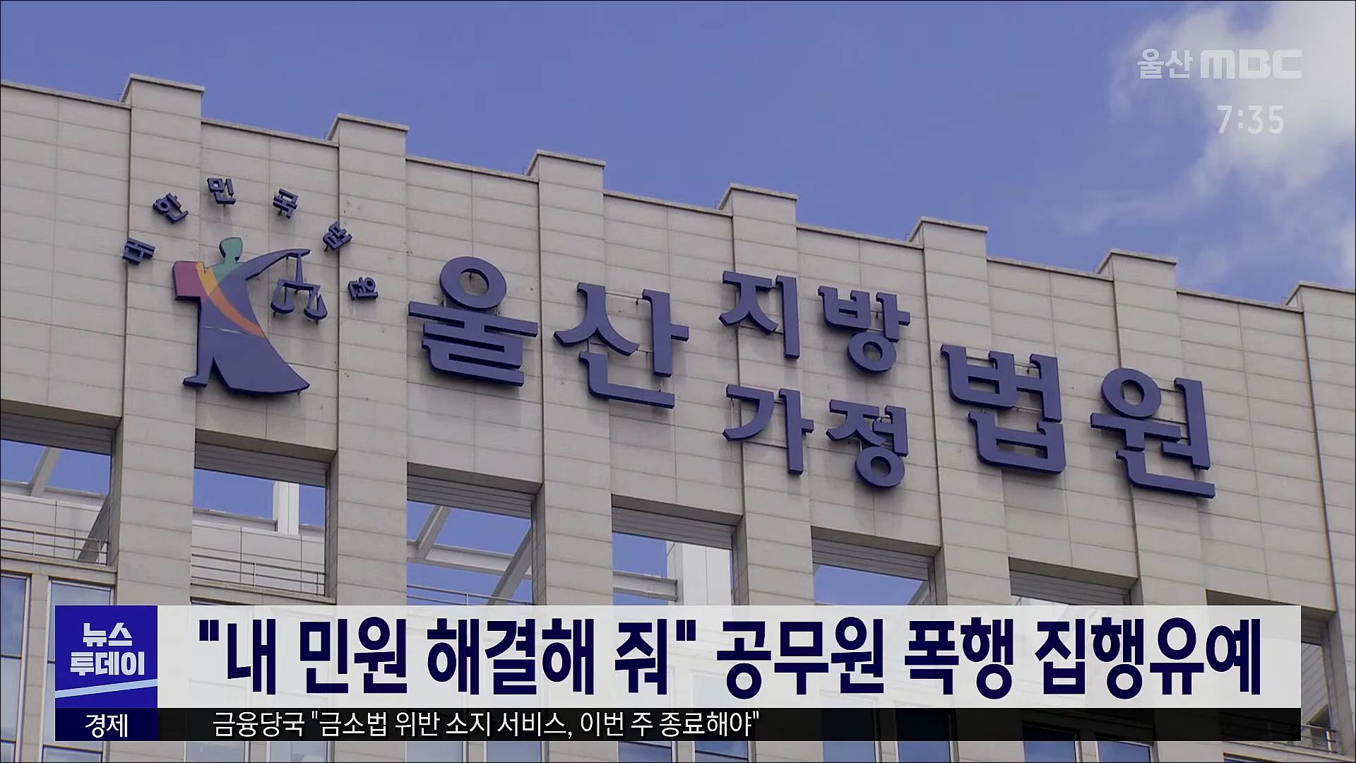 울산지법 형사9단독 정제민 판사는 통행로를 개설해 달라며 공무원을 폭행한 혐의로 기소된 30대 A씨에게 징역 10개월에 집행유예 2년을 선고했습니다. A씨는 지난해 7월 경남 양산시청에서 자신의 상가 옆으로 통행로를 개설해 달라며 공무원을 넘어뜨리고 목과 가슴 등을 누른 혐의로 재판에 넘겨졌습니다.//
