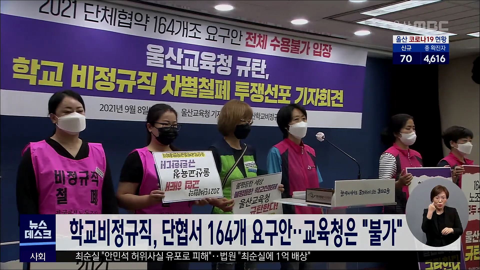 울산학교비정규직연대회의와 단체협상을 벌이고 있는 울산시교육청이 노조가 제출한 164개의 요구안에 대해 '수용불가' 입장을 보이자 노조가 반발하고 나섰습니다. 노조 요구안 가운데 주요 내용을 보면 전 직종의 유급 자율연수 20일 이상 보장, 방학중 비근무자 직종 상시전환, 각종 유급휴일, 특별휴가 일수 확대 등입...