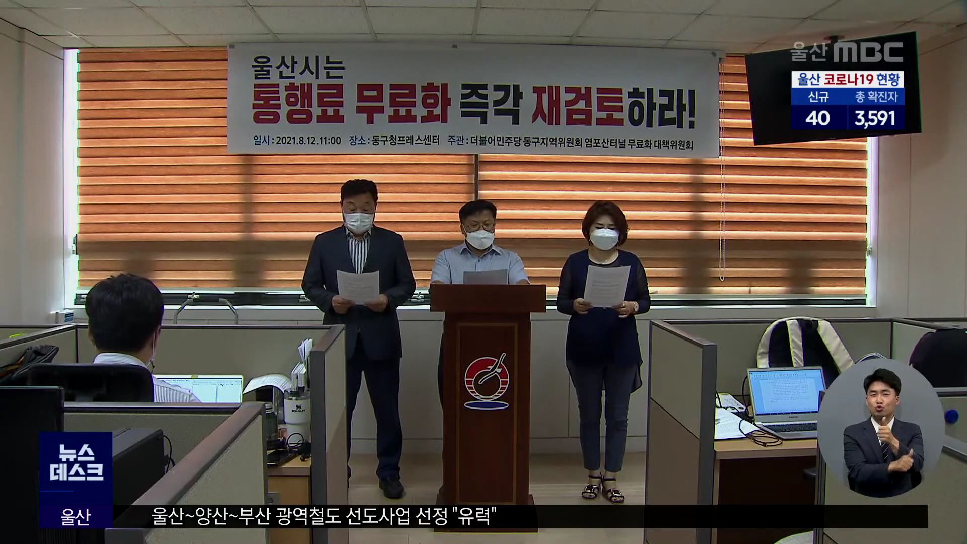 더불어민주당 동구지역위원회는 염포산 터널 무료화가 불가능 하다는 울산시의 답변에 대해 주민들을 외면하는 처사라고 비판했습니다. 위원회는 오늘(8/12) 동구청 프레스센터에서 기자회견을 열고 관광사업 발전을 이뤄가는 동구 길목에서 통행료를 받는 것은 관광발전과 엇박자가 나는것이라며 무료화를 주장했습니다. ...