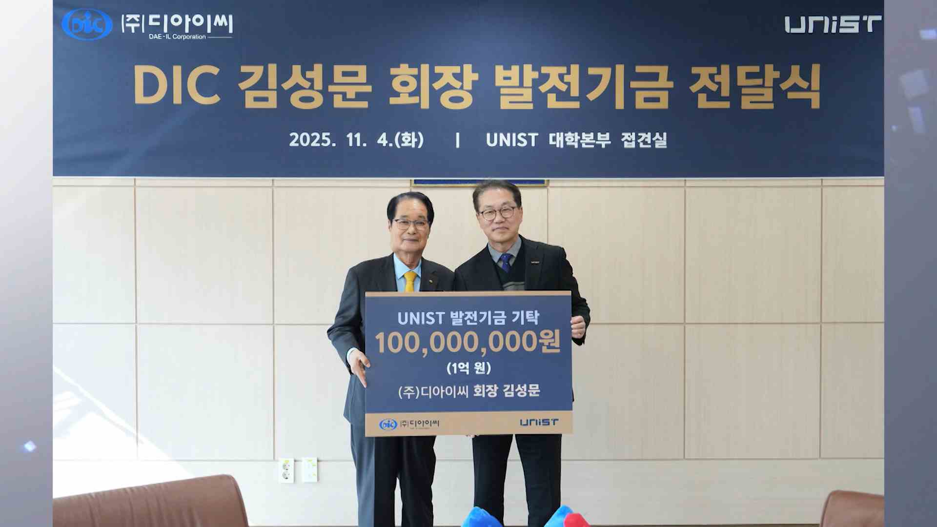 자동차 부품을 제조하는 울산기업 디아이씨의 김성문 회장이 UNIST에 발전기금 1억 원을 전달했습니다. 김 회장은 인공지능이 제조업의 새로운 경쟁력이 될 것이라며 UNIST에 AI 기반 자율주행과 스마트제조 개발에 힘써 달라고 당부했습니다. 디아이씨는 울산 울주군 두동면에 본사를 둔 자동차·중장비 구동계 전문기업입...