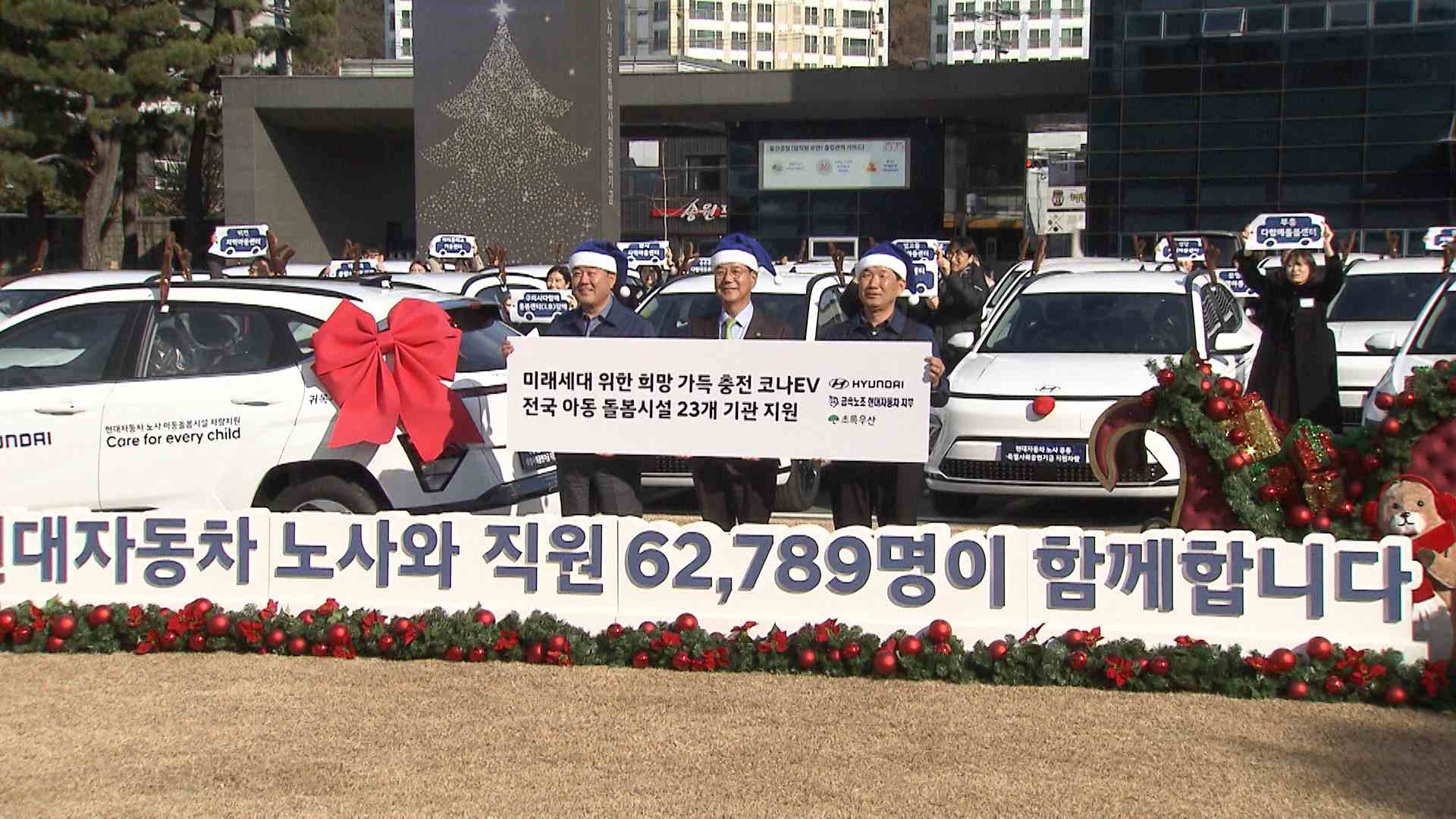 현대차 노사는 오늘(12/23) 울산공장 본관에서 특별 사회공헌기금 전달식을 열고 초록우산 어린이 재단 등에 성금 15억 원을 기탁했습니다. 전달된 기금은 전국 18개 지역아동센터와 4개 다함께돌봄센터 등 23개 아동복지기관에 코나 전기차 1대씩 기증하는 데 사용됩니다. 현대차는 이번 지원을 포함해 2005년부터 복지시...