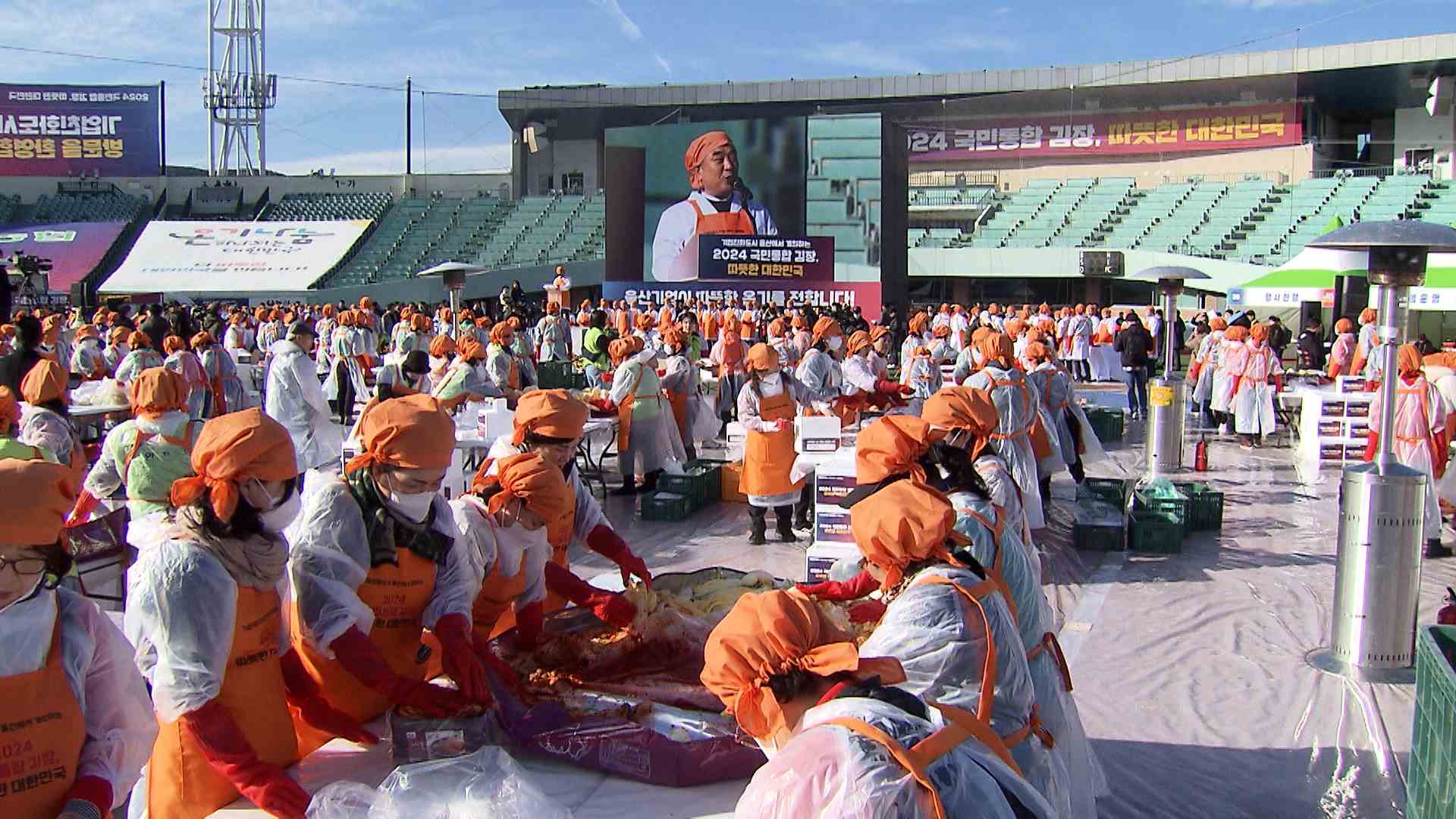 2024 국민통합 김장행사가 오늘(12/3) 오후 울산 문수야구장에서 열렸습니다. 이번 행사에는 전국 17개 시도 자원봉사자와 지역 기업 관계자 등 1천400여 명이 참여해 김치 6천 포기를 담갔습니다. 오늘 만든 80t의 김치는 기부 단체를 통해 전국의 결식 아동과 독거 노인 등 소외 계층에게 전달됩니다.