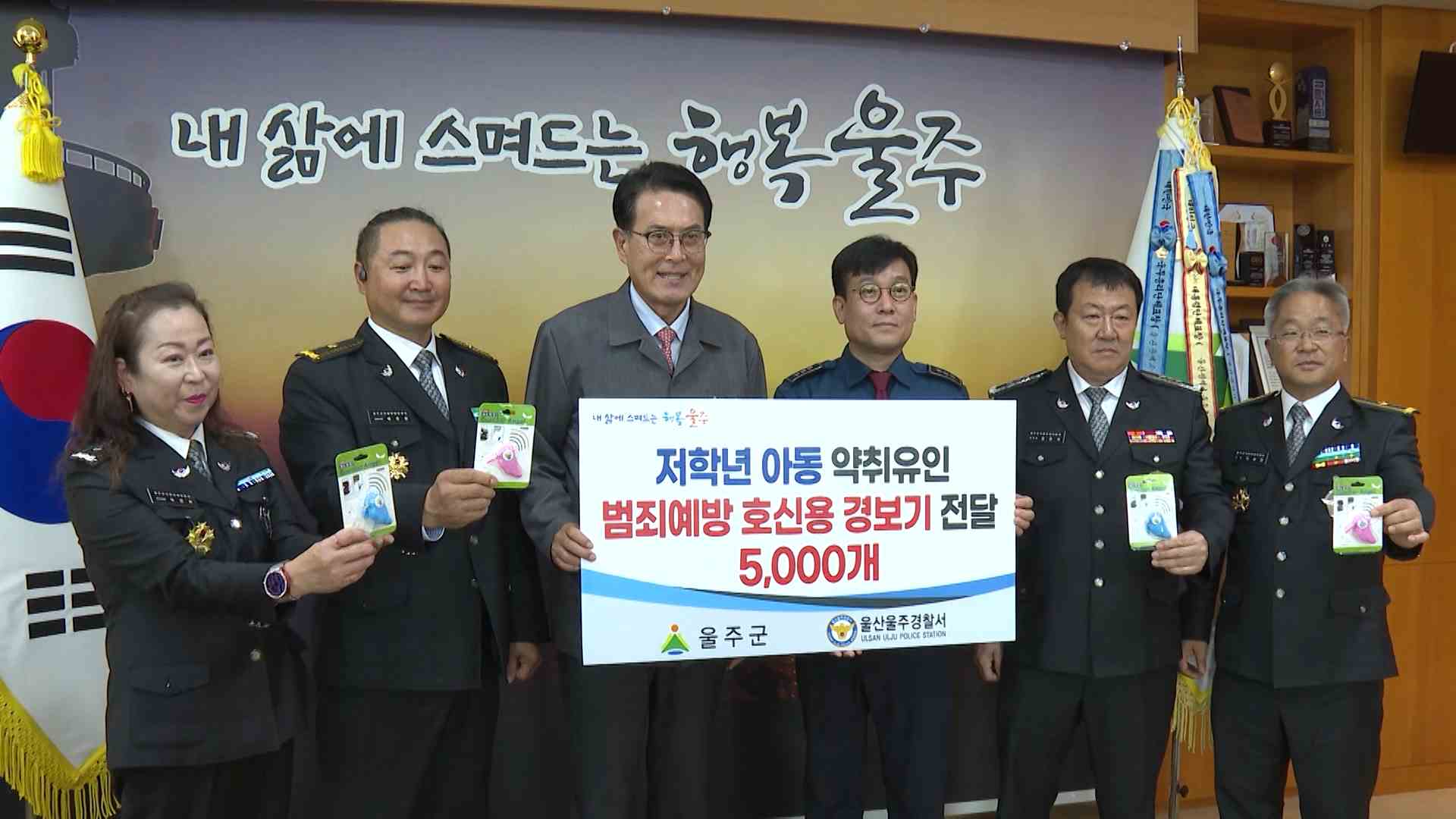 울산 울주군이 울주경찰서와 함께 어린이 유인 범죄 예방을 위한 호신용 경보기를 보급합니다. 울주군은 위급 상황 시 고리를 잡아당기면 경보음이 울리는 호신용 경보기 5천 개를 경찰에 전달해 초등학교 저학년 학생에게 배부한다고 밝혔습니다. 울주군 지역 초등학교는 31곳으로 1학년에서 3학년 학생 4천5백여 명에게 ...