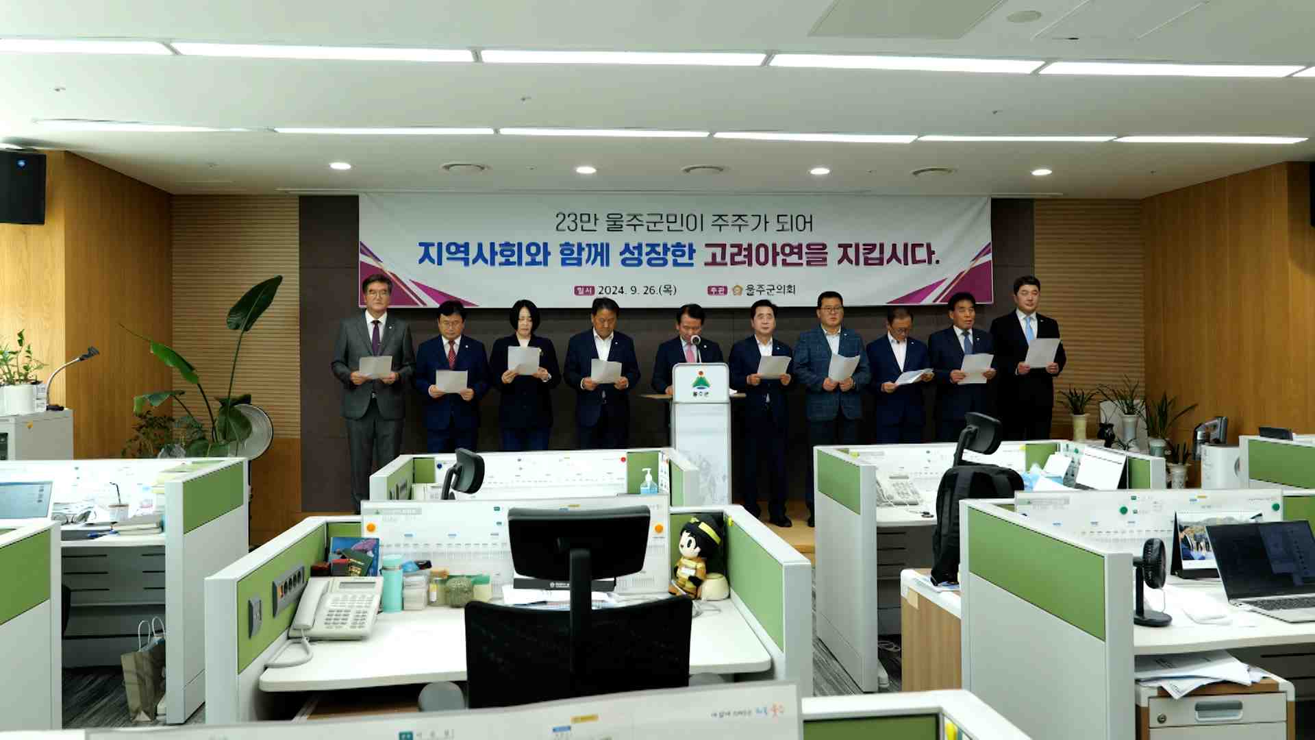 울주군의회 의원들이 오늘(9/26) 울주군 프레스센터에서 기자회견을 갖고 고려아연 1인 1주식 갖기 운동에 동참한다고 밝혔습니다. 의원들은 영풍과 사모펀드 MBK 파트너스의 고려아연 경영권 위협에 깊은 우려를 표하며, 23만 울주군민이 향토기업인 고려아연의 주주가 돼달라고 호소했습니다. 한편 울산 지역에서 고려아...