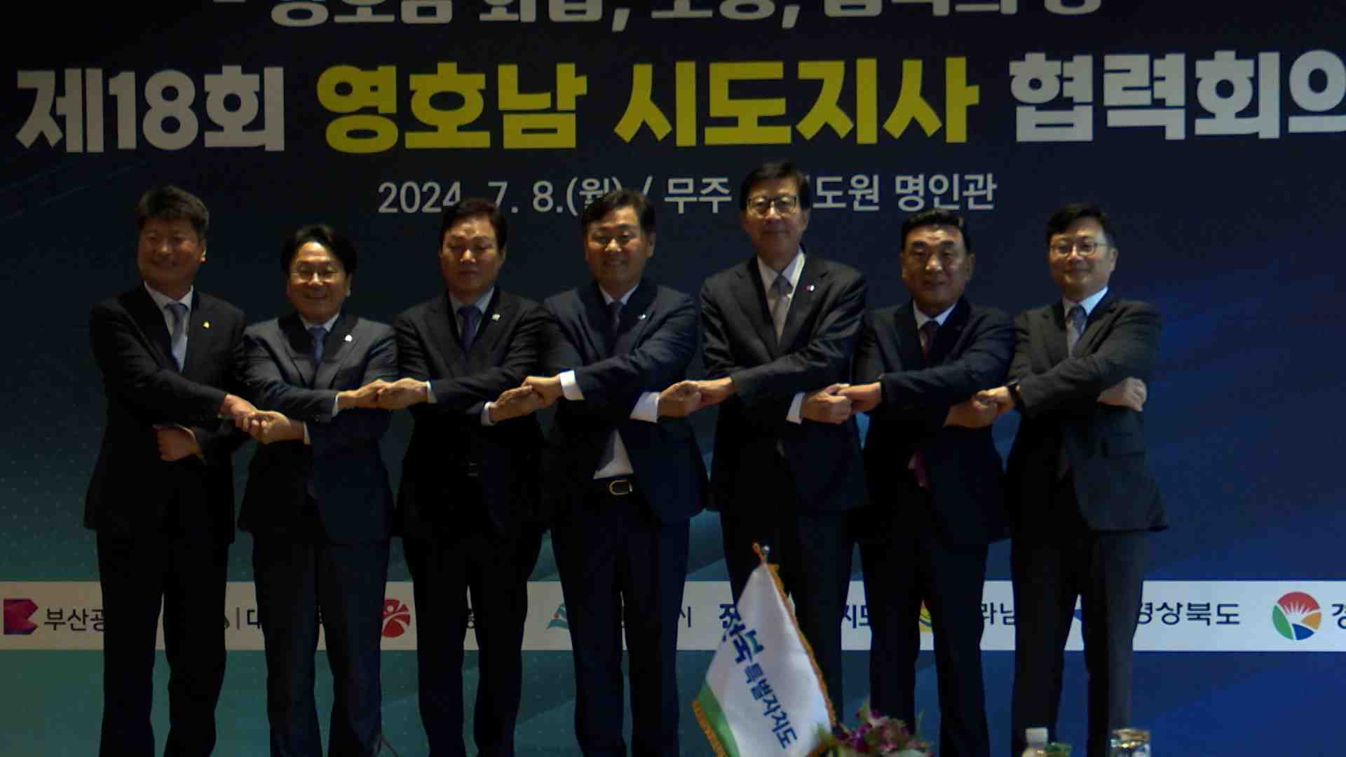 [앵 커] 오늘(7/8) 영호남 8개 시도지사 회의에서 대정부 성명서가 체결됐습니다. 성명서에는 울산시가 줄곧 요구해온 그린벨트 해제 요건 완화와 울산-전주간 고속철도, 울산-양산간 고속도로 건설 등이 담겼습니다. 조창래 기자가 보도합니다. [리포트] 영남과 호남의 8개 시도지사가 모두 한 자리에 모였습니다. 지방분...