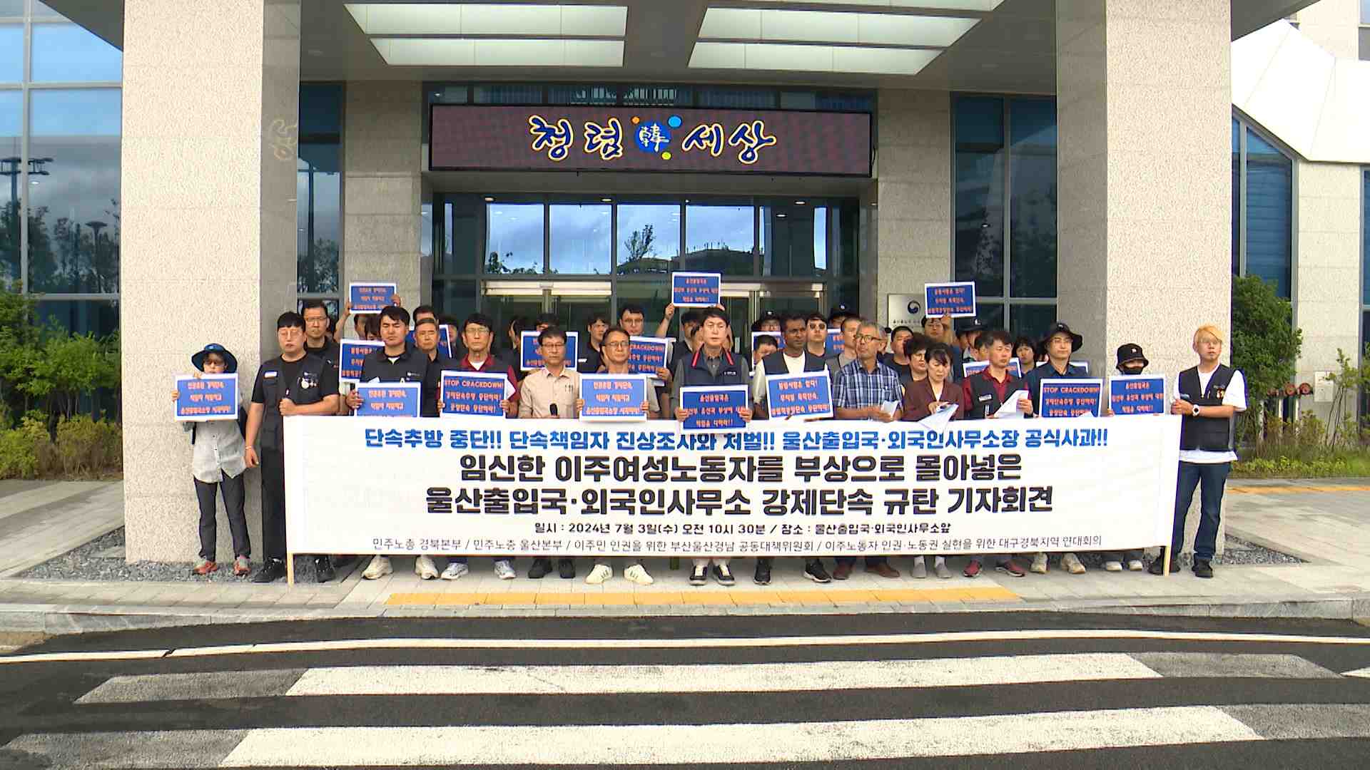 민주노총 울산지역본부가 기자회견을 열고 출입국 당국이 단속 지침을 무시하고 무리한 강제 단속을 벌였다고 책임자 처벌을 요구했습니다. 민주노총은 울산출입국외국인사무소가 지난달 20일 경주의 한 제조업체에 사업주 동의 없이 무리한 단속을 벌여 여성 이주노동자가 유산했다고 주장했습니다. 이는 출입국 당국의 성...