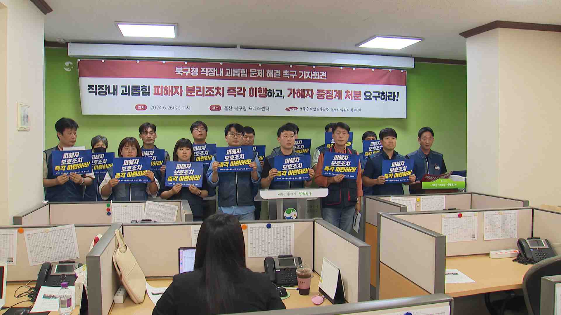 전국공무원노동조합 울산 북구지부는 오늘(6/26) 기자회견을 열고 최근 발생한 직장 내 괴롭힘 문제의 조속한 해결를 촉구했습니다. 노조는 회식 불참 시 업무상 불이익, 고성과 폭언 등 직장 내 괴롭힘 사건이 신고됐지만 가해자와 피해자가 분리 조치 되지 않고 있다고 주장했습니다. 이에 대해 북구청은 사건 조사 결과 ...
