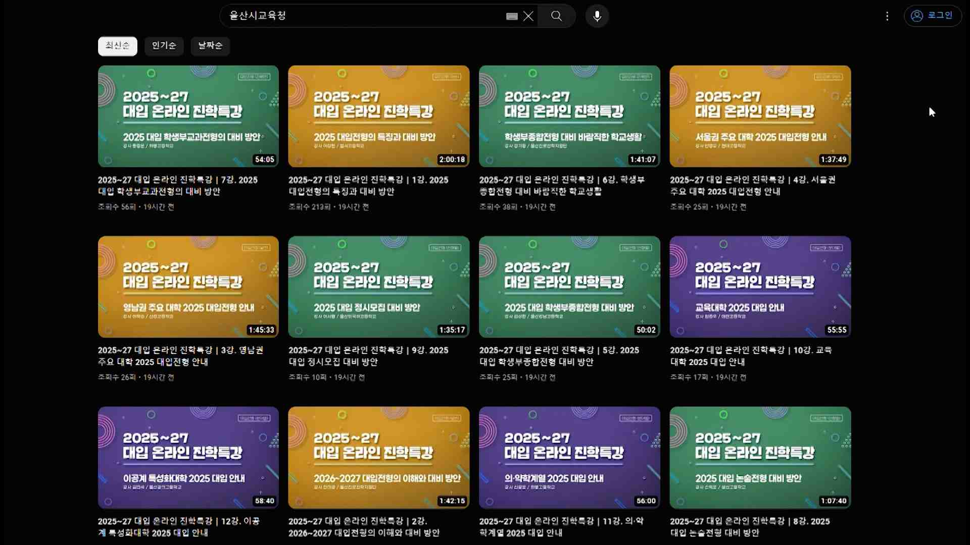 울산시교육청 진로진학지원센터가 고등학생의 대입 진학을 돕기 위해 '2025~2027 대입 온라인 진학특강'을 제작해 울산교육청 유튜브에 공개했습니다. 진학특강은 총 12개 강좌로 수시와 정시모집, 학생부교과와 종합전형, 서울과 영남권 대입전형을 각각 설명합니다. 또 학생들에게 인기가 있는 의약학계열과 이공계 특성...