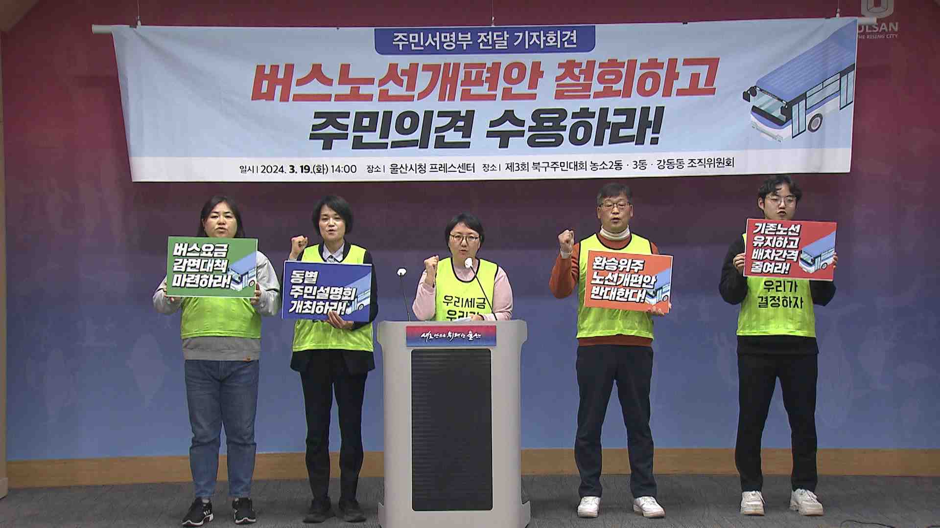 북구주민회는 오늘(3/19) 기자회견을 열고 울산시가 추진하는 시내버스 개편안 철회를 요구했습니다. 이들은 울산시의 시내버스 노선 전면 개편이 교통체증과 요금인상을 불러온다며 주민간담회를 요구했습니다.울산시는 주민 의견을 충분히 수렴하고 검토하고 있다며 시민들의 불편함이 최소화되도록 최선의 안을 찾겠다고...