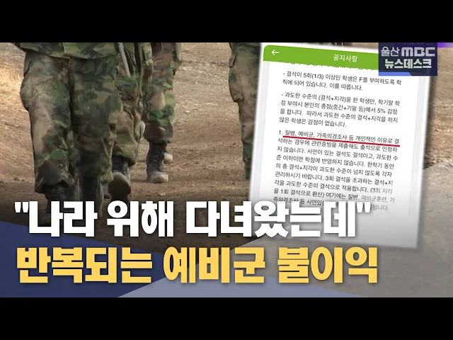 ◀ 앵 커 ▶ 울산대학교의 한 학과 수업에서 담당 교수가 학생들의 예비군 훈련을 출석으로 인정하지 않겠다고 공지해 논란이 일고 있습니다. 학생들은 법으로 보장된 예비군 훈련을 인정하지 않는 것은 불공평하다고 불만을 쏟아냈습니다. 정인곤 기자 ◀ 리포트 ▶ 울산대학교 학생들의 인터넷 커뮤니티. 질병과 예비군, 가족...