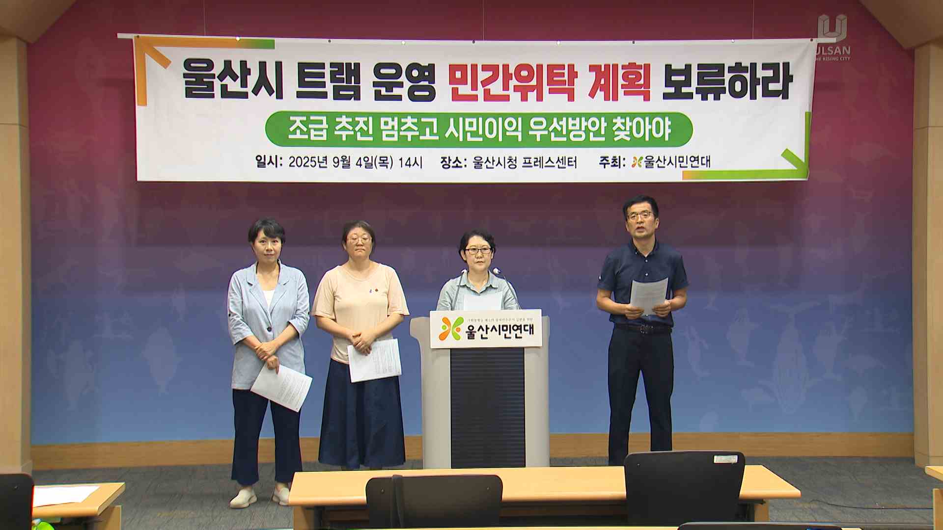 울산시민연대는 오늘(9/4) 기자회견을 열고 울산 도시철도 1호선과 태화강역과 장생포를 오가는 트램 노선의 민간 위탁 운영 계획 보류를 요구했습니다. 시민연대는 타 도시처럼 교통공사를 만들어 버스와 도시철도 등의 대중교통을 통합 관리하는 행정 서비스가 구축돼야 한다고 강조했습니다. 이에 대해 울산시는 공기업 ...