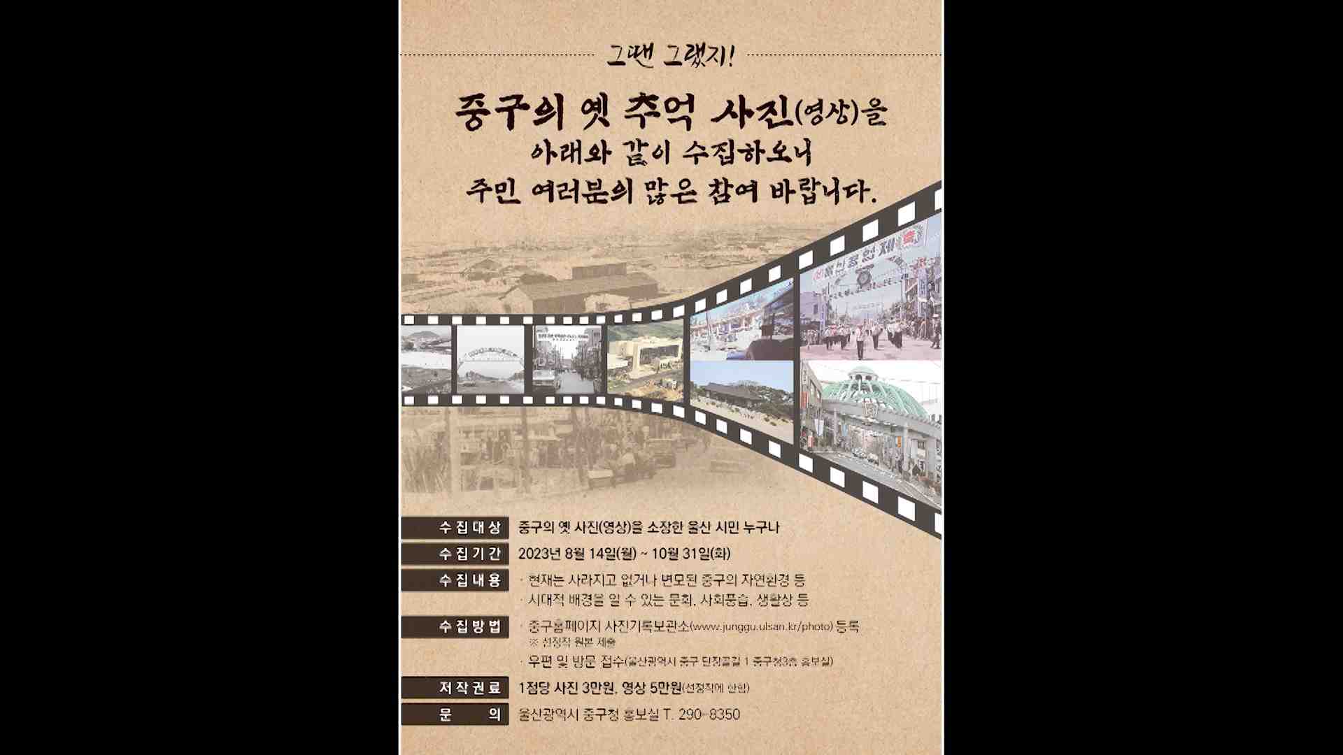 울산 중구청이 옛 추억이 깃든 사진과 영상을 공모합니다. 이는 역사와 문화적 가치가 뛰어난 사진과 영상 자료를 발굴해 기록물로 보존하고자 하는 것입니다. 1960년대에서 1990년대 사진과 영상을 오는 10월말까지 공모하며 심사를 거쳐 선정된 작품은 원고료로 사진은 3만원에서 영상은 5만원을 지급합니다.