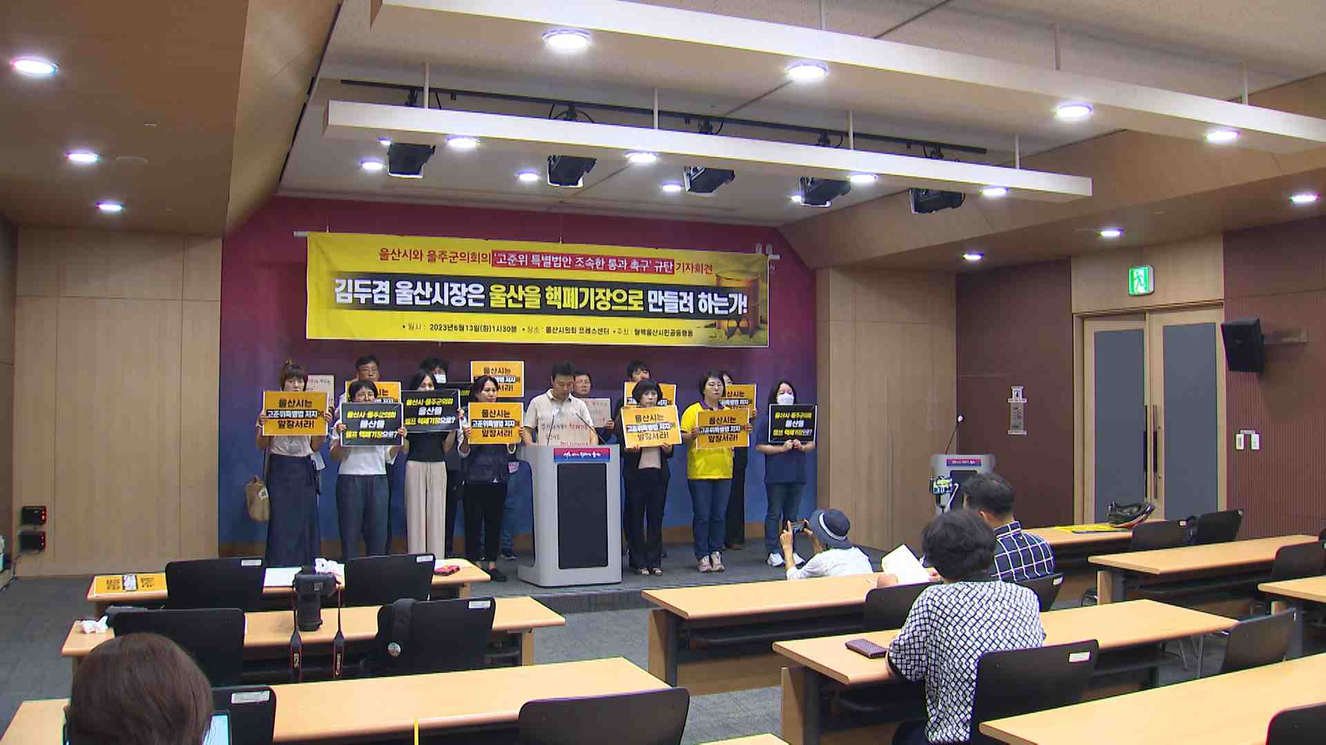 울산 울주군 등 원전 소재 지자체 5곳이 고준위 폐기물 특별법 제정을 촉구하고 나선 가운데 탈핵시민단체는 이에 대한 반대입장을 나타났습니다. 탈핵울산시민공동행동은 오늘(6/13)기자회견을 갖고 고준위 폐기물 특별법이 고준위 방사성 폐기물의 원전 부지 내 저장을 고착화하는 내용을 담고 있다며 반대입장을 표했습...