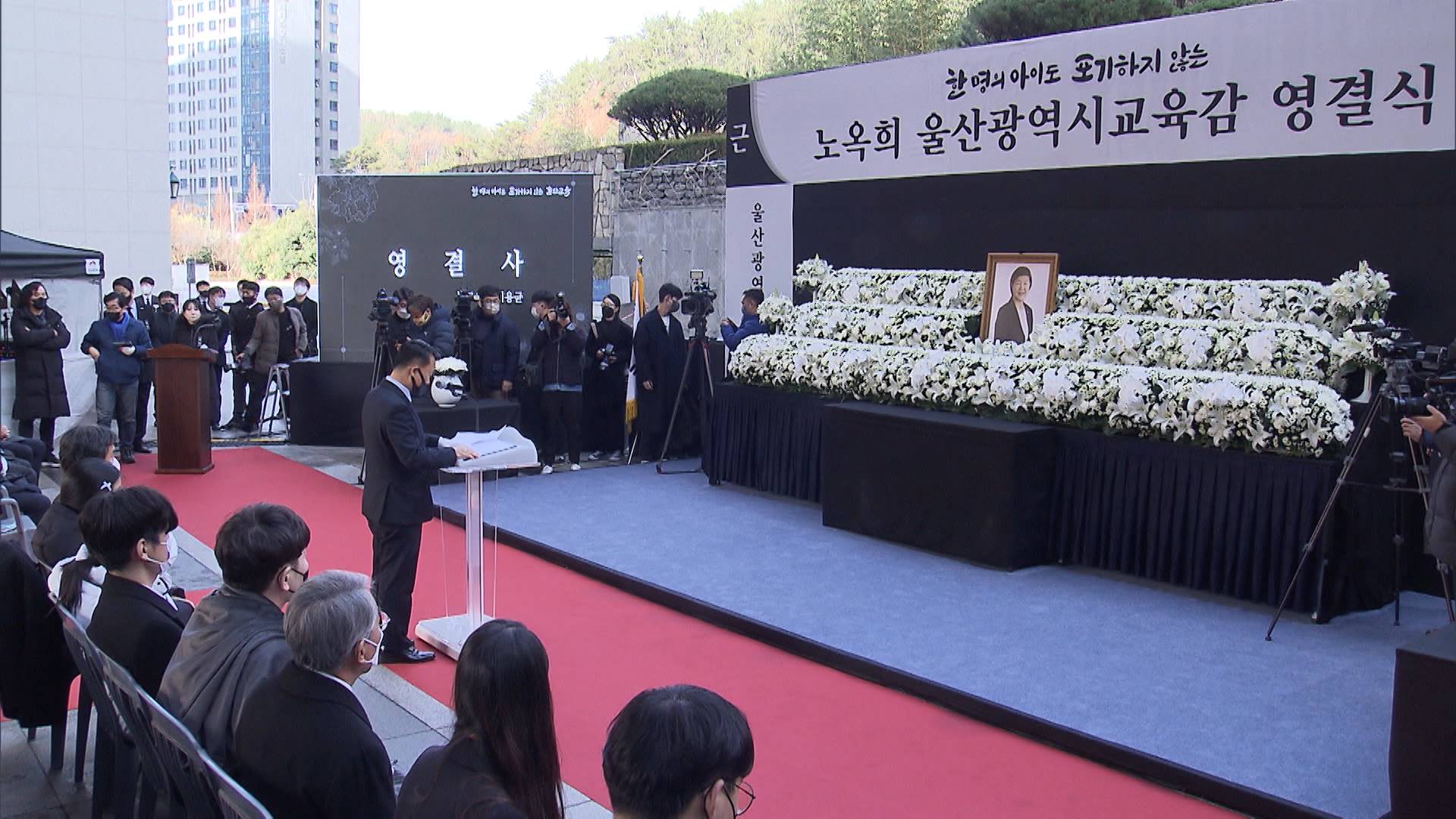 지난 8일 별세한 노옥희 교육감의 영결식이 오늘(12/12) 오전 10시 울산시교육청에서 거행됐습니다. 오늘(12/12) 영결식에는 정치인과 유관기관장, 시민사회단체, 학부모 등 300여명이 참석해 고인의 넋을 기렸습니다. 장례위원회 위원장인 이용균 부교육감은 영결사에서 “교육감님의 새로운 교육에 대한 열망을 우리는 잊...