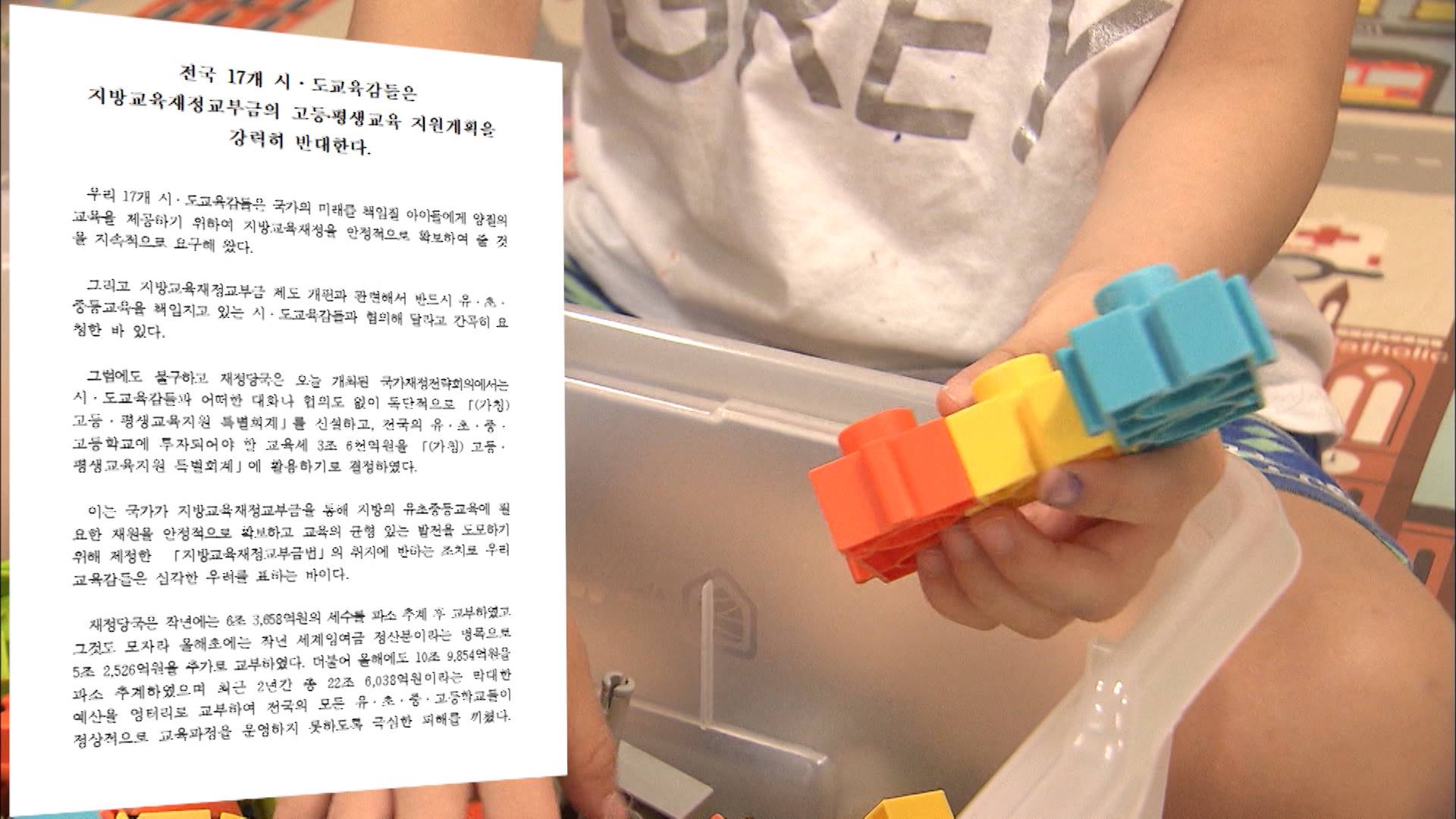 전국시도교육감협의회는 오늘(7/7) 성명서를 통해 유치원과 초중고등생을 위해 써야 할 지방교육재정교부금을 고등교육과 평생교육에 활용하는 것을 강력히 반대한다고 밝혔습니다. 이들은 예산축소는 교육의 질적 하락으로 가져오게 될 잘못된 결정이라며 시도교육감이 참여한 가운데 논의를 다시 시작해야 한다고 주장했...