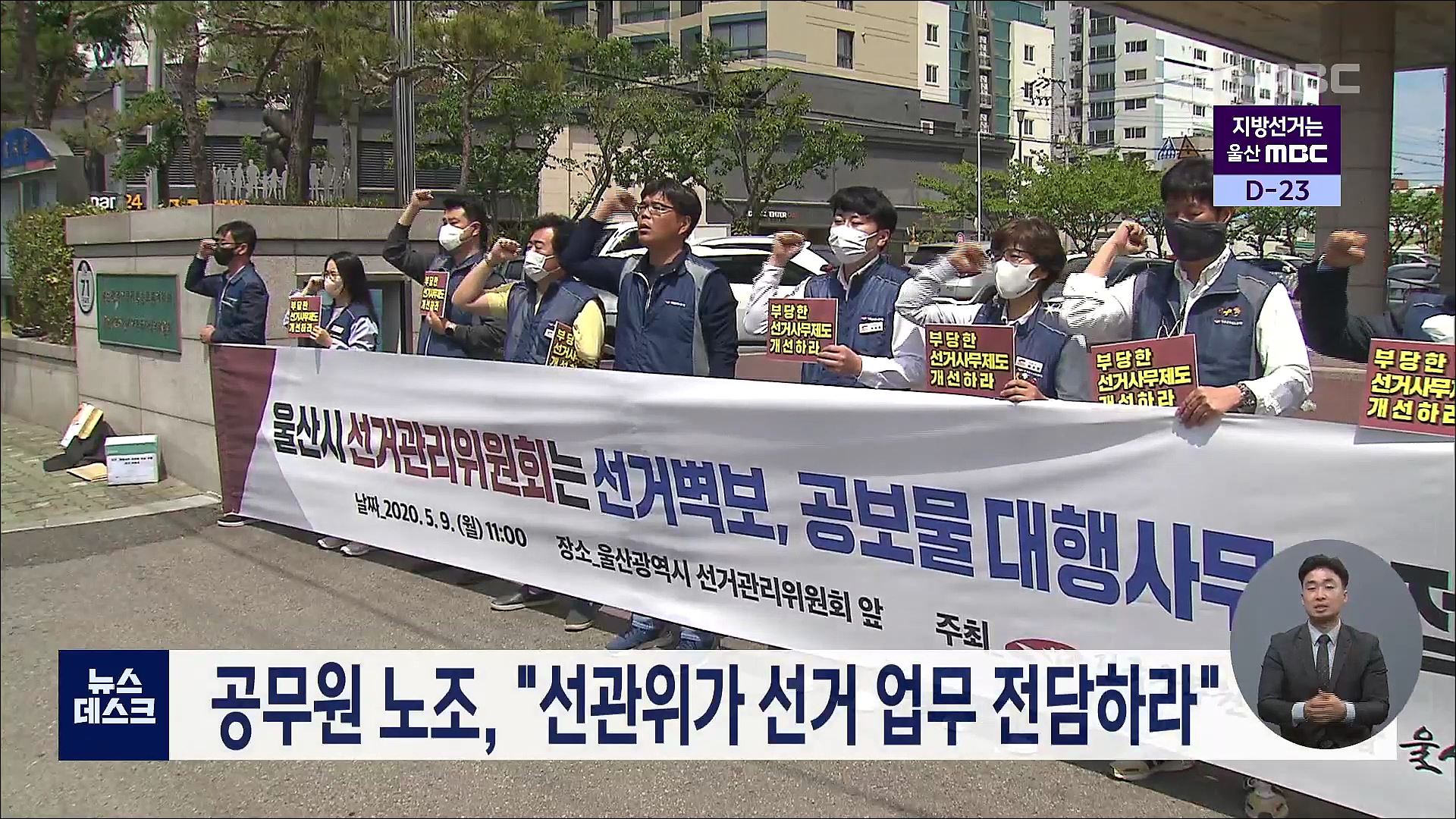 전국공무원노조 울산본부는 오늘(5/9) 울산시선거관리위원회 앞에서 기자회견을 열고 선거관리 업무는 선거관리 위원회가 전담하라고 주장했습니다. 이들은 각 행정복지위원회 공무원들이 본연의 업무가 아닌 선거벽보 부착과 공보물 분류, 배포 작업으로 과도한 업무에 시달리고 있다고 비판했습니다. 이에 대해 울산선관...