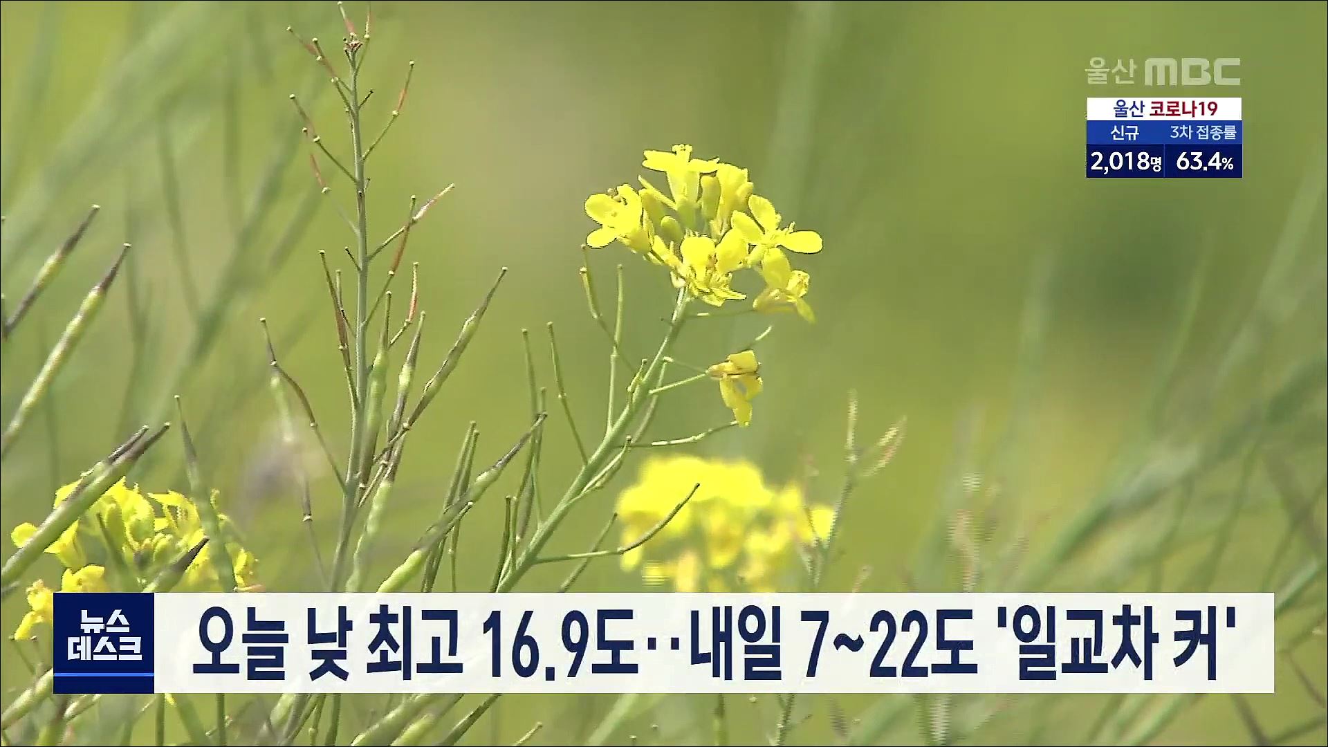 오늘 울산지방은 맑은 가운데 낮 최고 기온 16.9도를 기록했습니다. 일요일인 내일도 대체로 맑겠으며 아침 최저 7도, 낮 최고 22도의 기온 분포를 보여 포근하겠습니다. 울산기상대는 낮과 밤의 일교차가 15도 내외로 매우 클 것으로 예상된다며, 건강관리에 각별히 유의할 것을 당부했습니다.