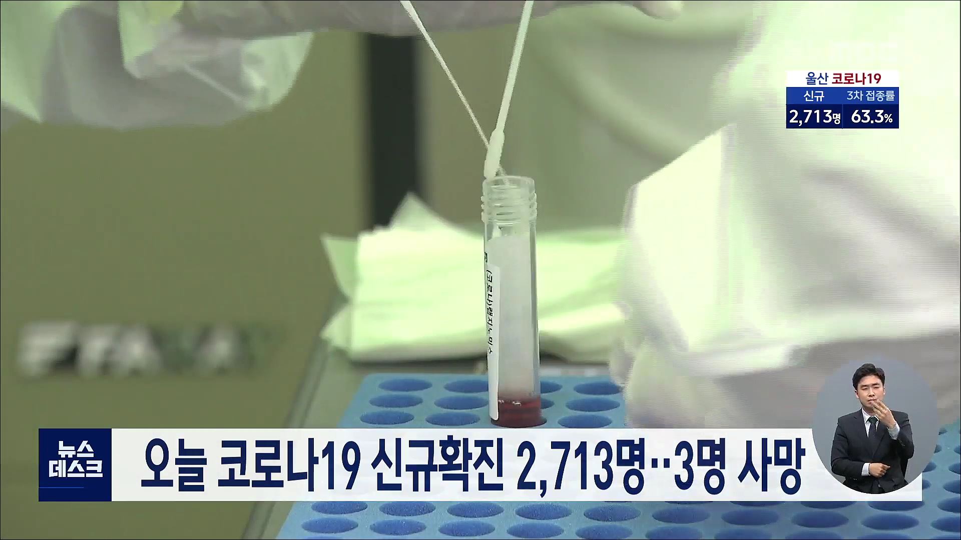 오늘(4/14) 울산에서는 코로나19 신규 확진자가 2천 713명 발생했습니다. 또 40대 확진자 등 3명이 숨져, 울산의 코로나19 누적 사망자는 298명까지 늘어났습니다. 오늘(4/14) 0시 기준으로 울산에서는 인구의 63.3%가 코로나19 백신 3차 접종을 마쳤습니다.