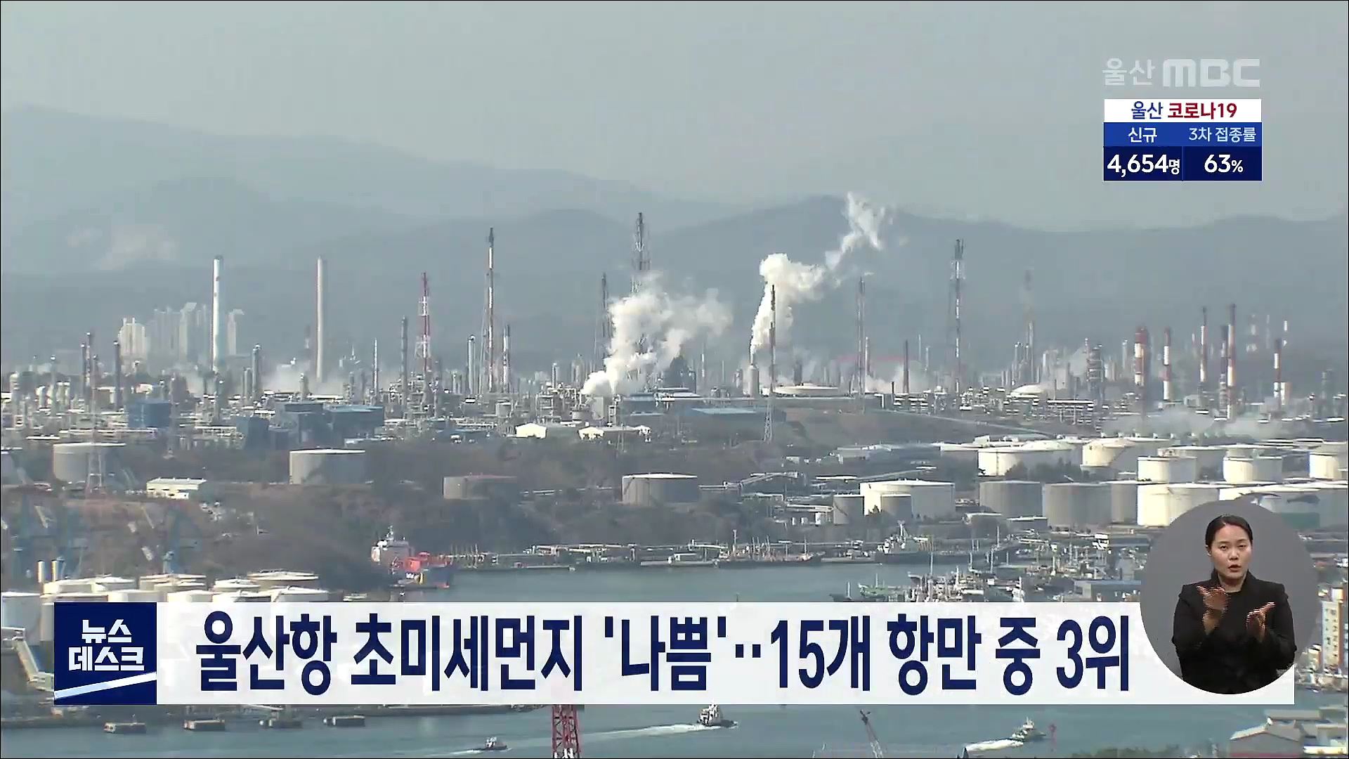 울산항의 초미세먼지 평균농도가 전국 평균을 크게 웃돌아 전국 15개 항만 가운데 평택당진항과 포항항 다음으로 세 번째로 나쁜 것으로 나타났습니다. 환경부가 지난해 12월부터 넉 달 동안 실시한 ‘제3차 미세먼지 계절관리제’ 결과를 보면 울산항의 초미세먼지 평균농도는 m³당 31.3마이크로그램으로 전국 평균인 25.8마...