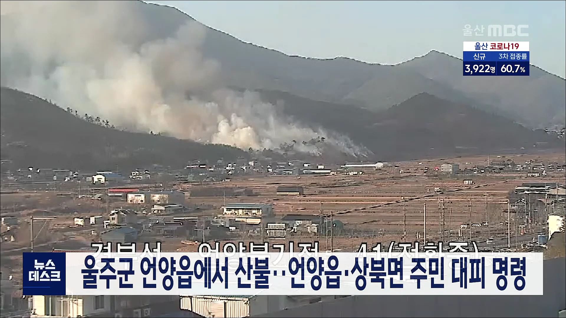 전국적으로 산불이 일고 있는 가운데 울산에서도 오늘(3/6) 오후 3시 48분쯤 울주군 언양읍 직동리에서 산불이 났습니다. 불이 나자 울산소방본부가 대응 1단계를 발령해 인력 300여 명, 헬기 등 장비 10여 대를 동원해 진화에 나섰습니다. 현재까지 산림 5천 제곱미터 이상이 탔지만 인명피해는 없습니다. 울산소방본부는 ...