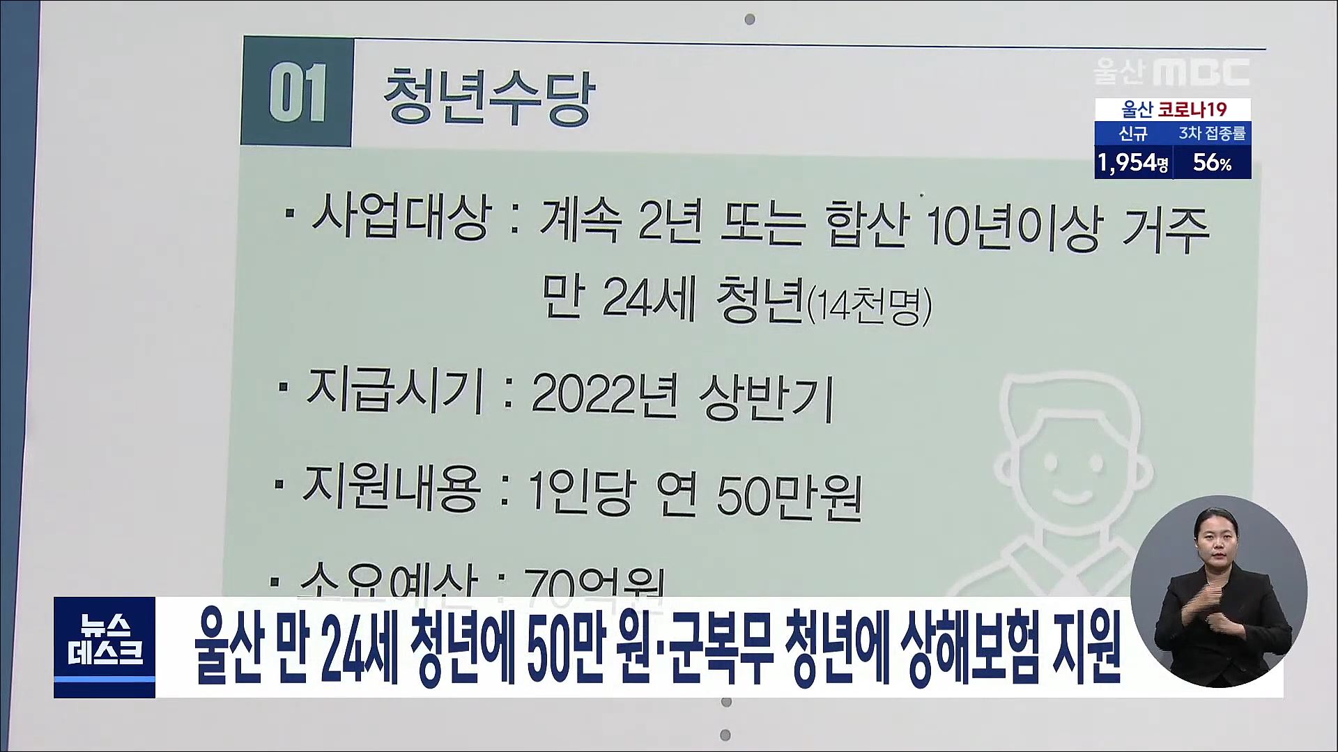 울산시가 '울산형 청년수당' 지급 사업을 시작합니다. 울산형 청년수당은 만 24세, 1997년생인 울산 청년에게 1년에 1차례 50만원을 지역 화폐로 지급하는 사업입니다. 울산시는 이와 함께 3월부터 군대에 간 울산 청년에게 별도의 절차 없이 보험에 가입되는 상해보험 지원 사업을 시작합니다.