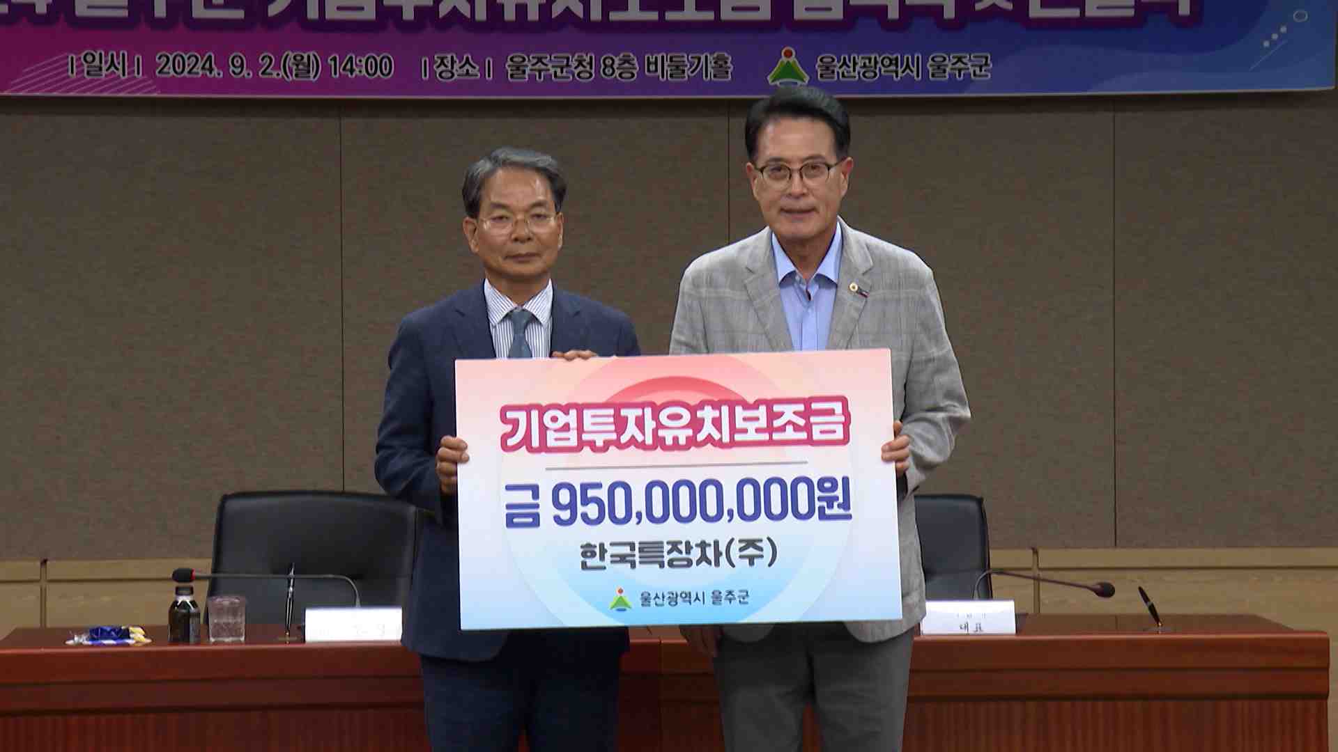 울주군은 오늘(9/2) 신규 투자 기업과 협약식을 갖고 투자 완료사에 보조금을 전달했습니다. 신한에이티와 대협테크 등 11개사는 총 1천 100억 원을 투자해 지역주민 250명을 채용할 계획입니다. 또 울주군은 투자를 완료한 기업 3곳에 투자 유치보조금 24억 원을 전달했습니다.
