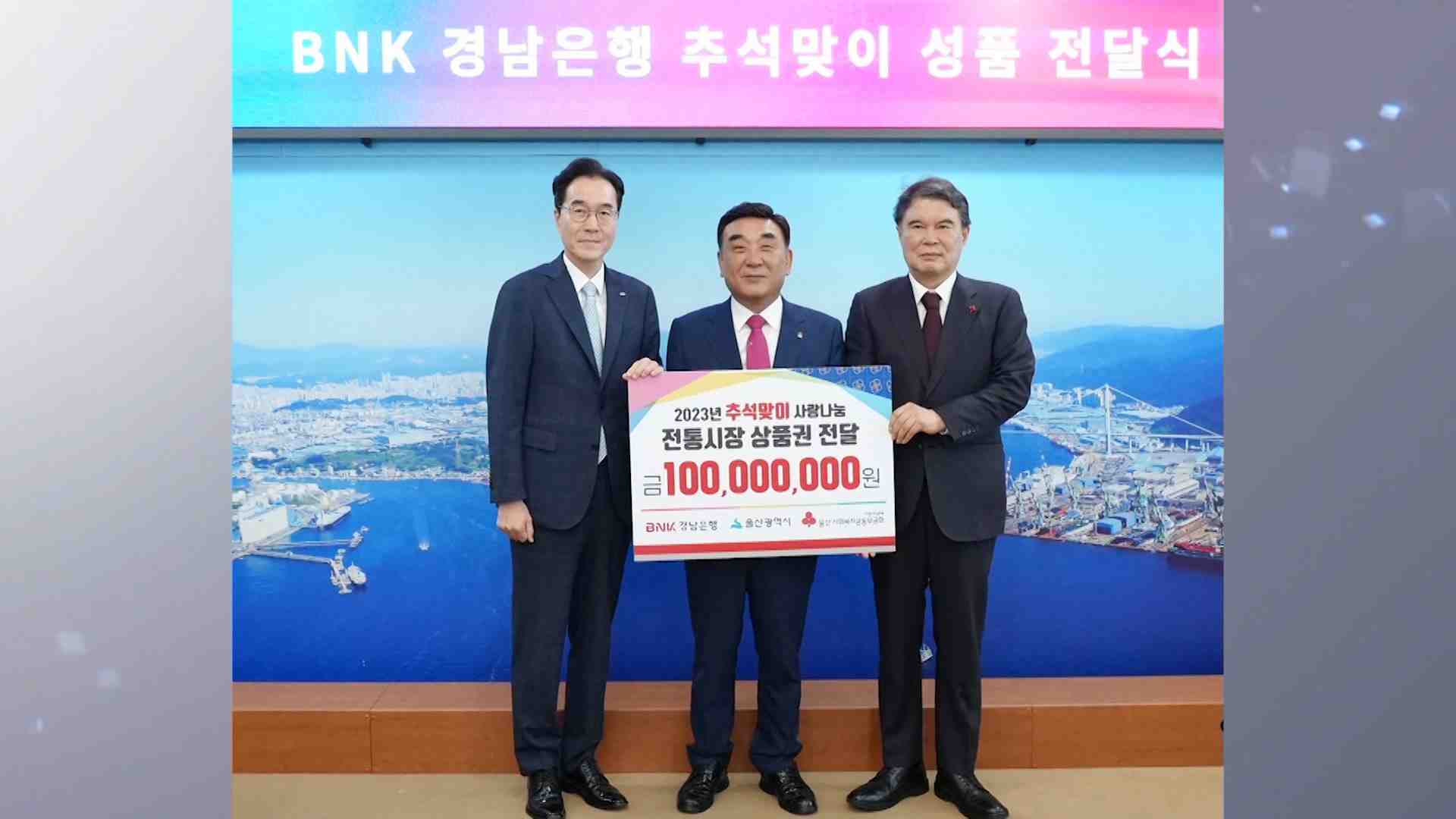 BNK경남은행은 오늘(9/18) 추석을 앞두고 울산시에 1억원 상당의 전통시장 상품권을 기탁했습니다.이번에 전달된 전통시장 상품권은 울산사회복지공동모금회를 통해 울산광역시 5개 구ㆍ군이 추천한 취약계층 2천 세대에 지원됩니다.BNK경남은행은 오는 29일까지 울산과 경남지역 소외계층 8천여 세대에 4억원 상당의 전통...